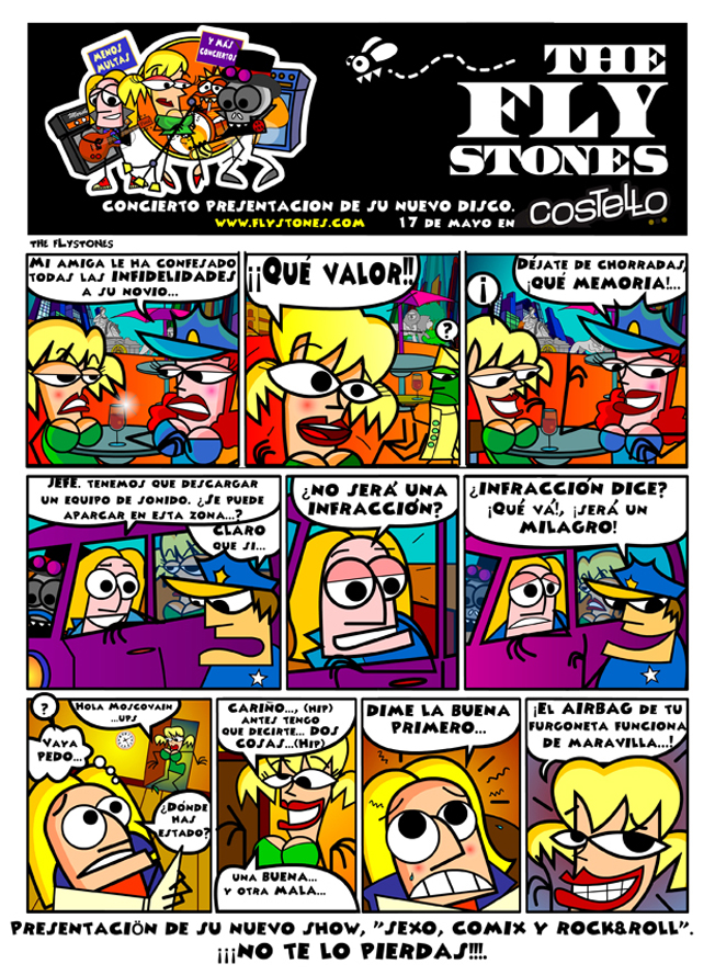 Y no a cualquier música, a la buena. Esa con solera, con callo, la canalla, la que hace que se te vayan los pies y pases un rato fantástico con tus colegas, birra en mano. Este domingo 17 de mayo en el Costello Club, dentro del Madrid Circuito Independiente 2009 y con motivo de tan señaladas fechas para la capital del reino, The Flystones darán una actuación en directo cargada de proyecciones y espectáculo para presentar su nuevo disco, al que han llamado  “The Flystones, mil millones de moscas no pueden equivocarse”. El grupo de Toni Marmota repartirá a quien se acerque una buena dosis de energía, ritmo y rock&roll del de siempre. A partir de las 21.30, no te olvides. Para que despedirte del puente no sea tan doloroso.