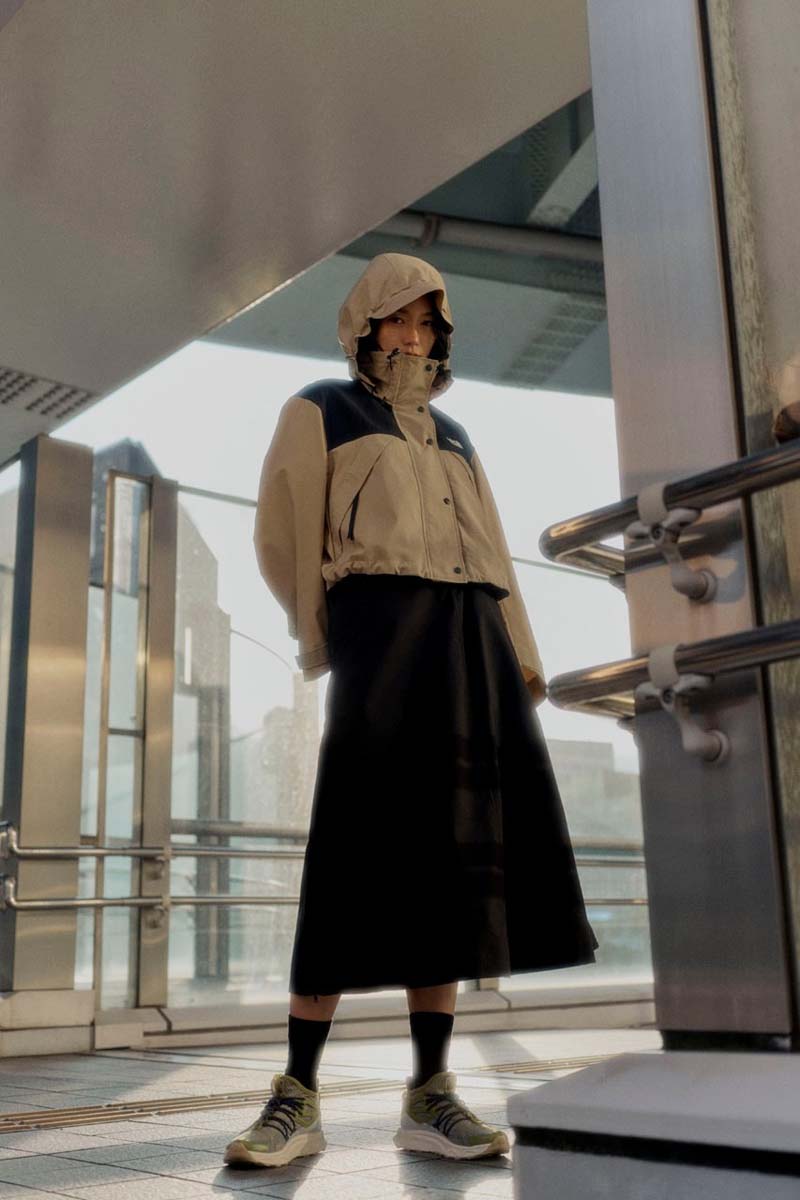 Esta primera entrega de la línea RE:EXPLORATION de The North Face propone siluetas liberadas de inspiración trekking. Los cortes se relajan y se reimaginan con construcciones más drapeadas y llenas de fluidez. Tenemos como estrella de la colección un cortavientos de línea A para mujer. A simple vista parece una prenda ordinaria de la firma… pero si nos fijamos nos podemos dar cuenta que es una prenda estupenda para un look de tendencia gorp core muy urbano. Presenta un corte cropped y mangas extra anchas, así como también un cuello alto para cubrir el rostro y una capucha con visera.