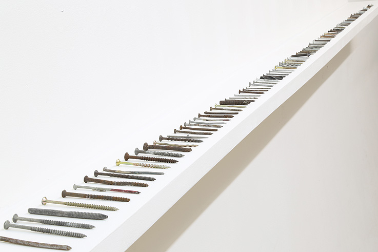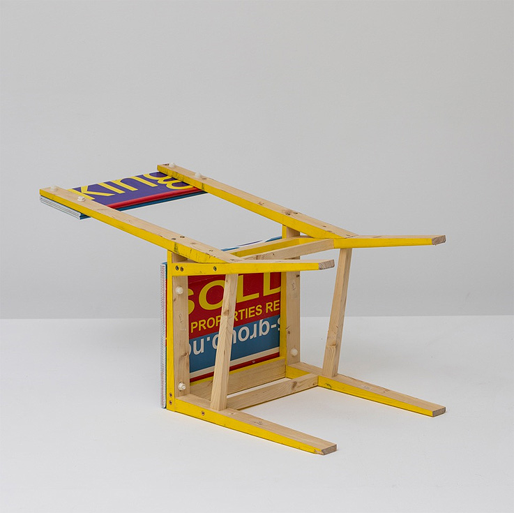 Encontramos el mismo espíritu irónico, delicado y crítico en las otras cuatro obras de la exposición que, por su parte, se presentan más como una reflexión sobre la vida de los objetos – entendidos éstos como síntomas de un funcionamiento de lo público – en un entorno de pura utilidad y máxima eficacia. En este sentido -cercano a esas corrientes de la desaceleración y lo slow- debe entenderse “Acts of Subtraction” de David Rickard, una “escultura pública de sustracción”, como dice la presentación, formada por una colección de tornillos y clavos eliminados del espacio público, en un gesto inverso al usualmente esperado. Otra vida también le dan al objeto público Zuza Golinska y Matt Calderwood. La primera con sus esculturas de barandas de acero inoxidable – “Piercer Series”– que ofrecen una reflexión sobre la manera en la que el espacio y la arquitectura de los lugares compartidos influencia y controla nuestros comportamientos. El segundo con su silla –“For Sale Chair (King)”– construida a partir de esas pancartas utilizadas por las agencias inmobiliarias y a menudo abandonadas que el artista decide “hacer propriedad suya” para “explotar sus propriedades”, como explica con humor.