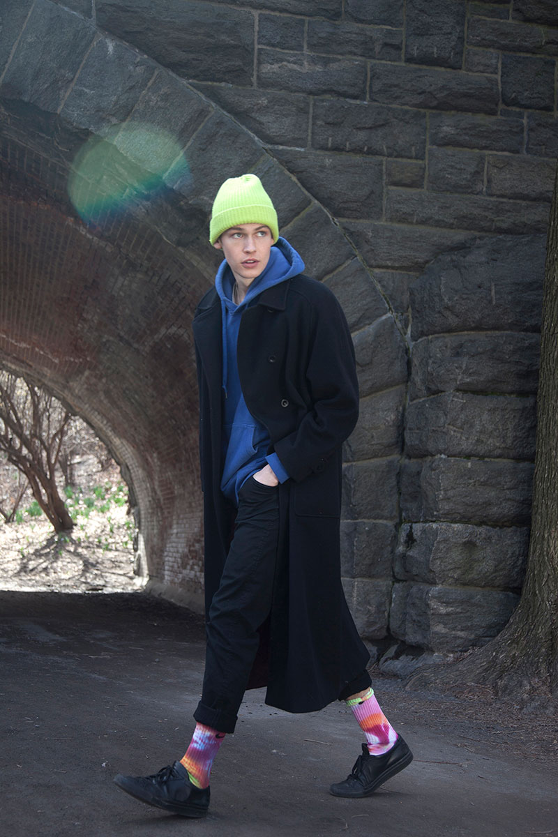En la foto de arriba, Ryan lleva abrigo vintage + Sudadera Uniqlo + Gorro Urban Outfitters + Pantalón Zara + Calcetines Small Studio + Zapatillas Vans
