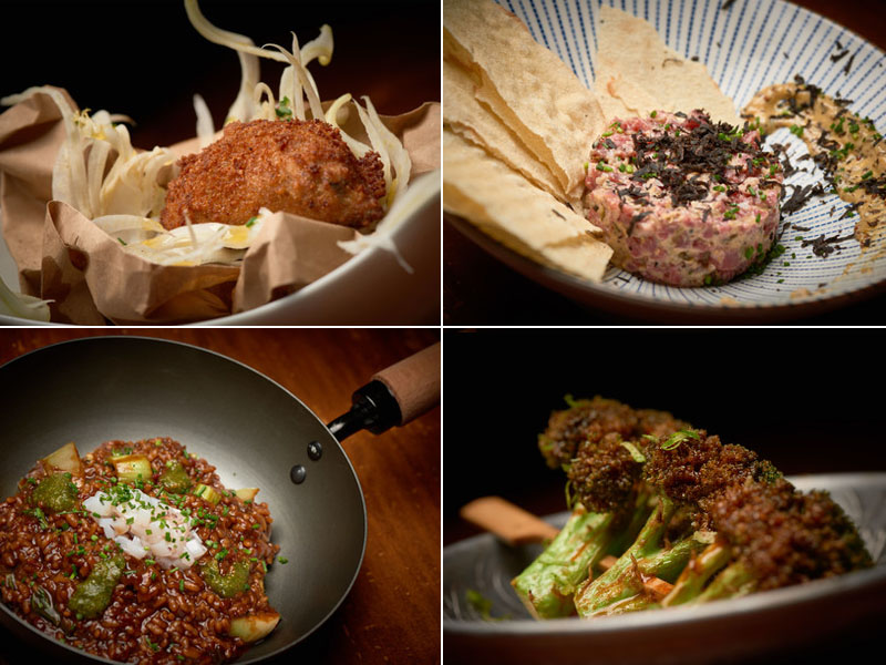 Imagen superior: selección de platos (mejillón tigre, steak tartar, arroz meloso y brócoli) de Taberna Recreo