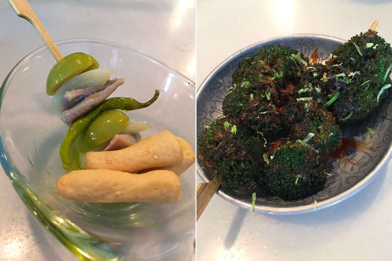 Imagen superior: gilda sardina, gordal, piparra y cebolleta. Imagen dcha: brócoli, kimchi, lima y comillo ahumado