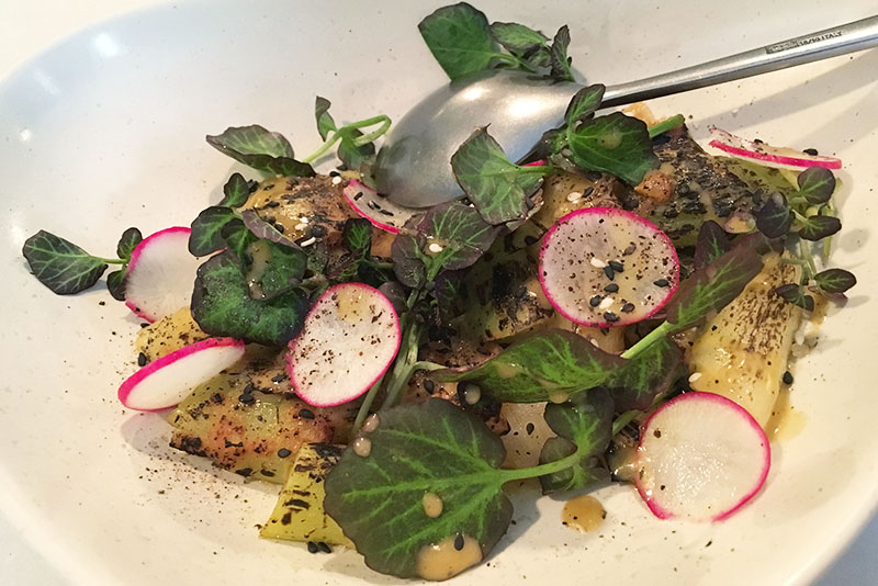 Imagen superior: puerro asado, sésamo, hierbas y rabanito