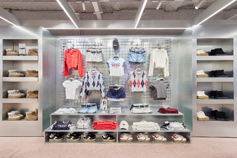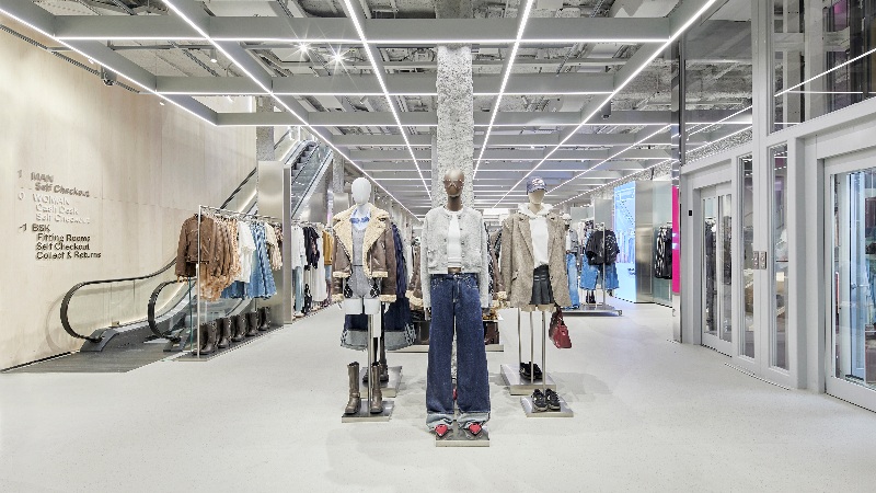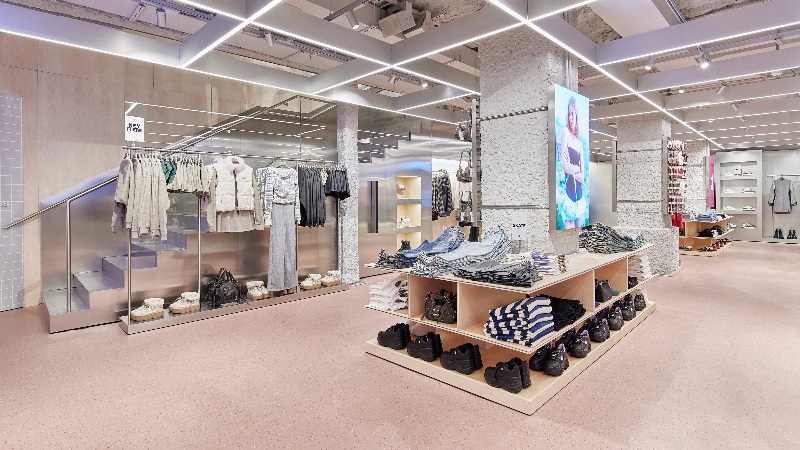 Entre las novedades de la nueva tienda de Bershka en Gran Vía destacan los elementos decorativos. Han añadido objetos de exposición, como una gran pared de piedra en la entrada que ofrece un recorrido visual por todo el espacio. También se ha renovado la zona de caja, ubicada dentro de un rectángulo de columnas con un techo de luz estilo patio, lo que facilita su identificación. Igual de relevante, o incluso más, es la instalación de pantallas LED cuadradas en la zona principal de las escaleras, que invitan a la relajación y facilitan la búsqueda de las últimas tendencias.