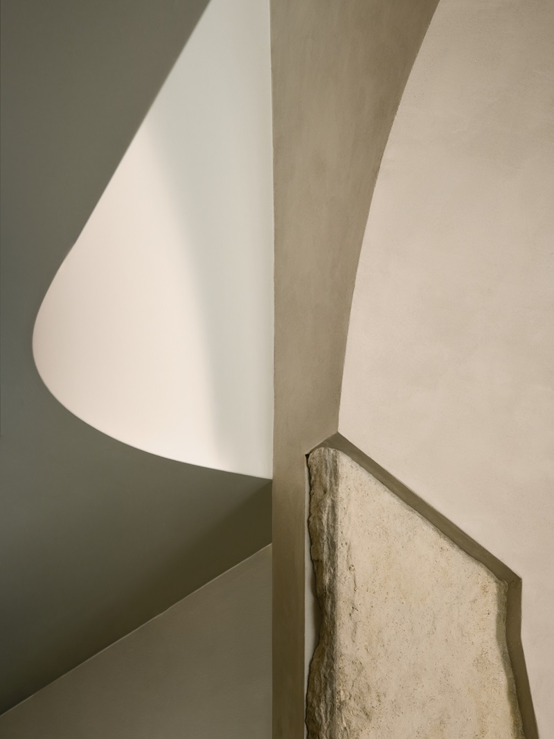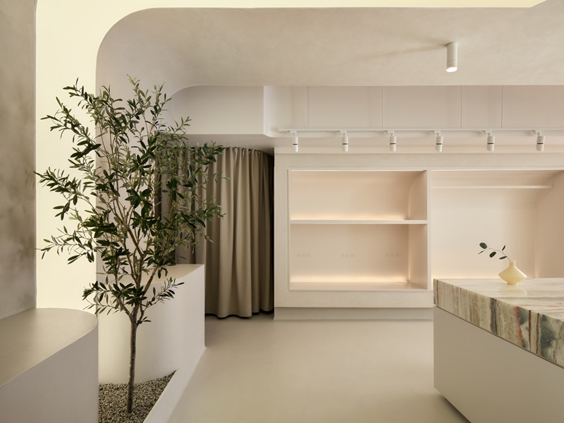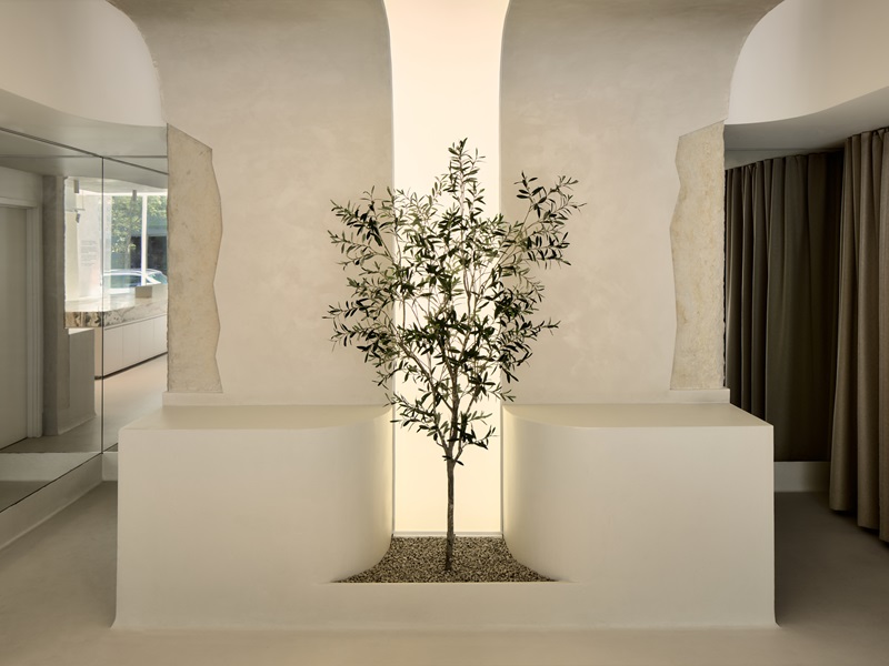 Diáfano, sereno y de proporciones simétricas. Así es este local destinado a rendir homenaje a la gratificante experiencia de viajar. Al fondo, un olivo sobre un pedestal capta todas miradas marcando la profundidad del espacio. El árbol, conocido como símbolo de la longevidad, la renovación y la prosperidad, rememora ese temperamento hospitalario tan característico de las pousadas de Portugal. Detrás, el equipo de Ste Marie Studio añade una instalación lumínica con forma de columna que enfatiza aún más la posición central del olivo.