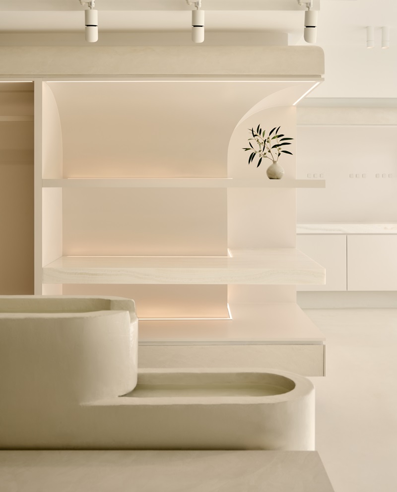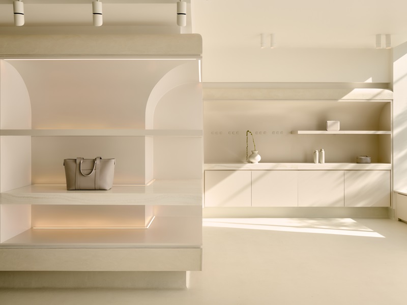 Suaves curvas se apropian de las refinadas paredes de yeso encerado, generando los nichos que exhiben las colecciones de equipajes y accesorios de viaje. La neutralidad del color crudo realza el carácter atemporal de la tienda de estética minimalista. Los estantes, acabados en el mismo tono, aparecen sutilmente decorados por la elegante piedra italiana natural de Onice Striato Avorio.