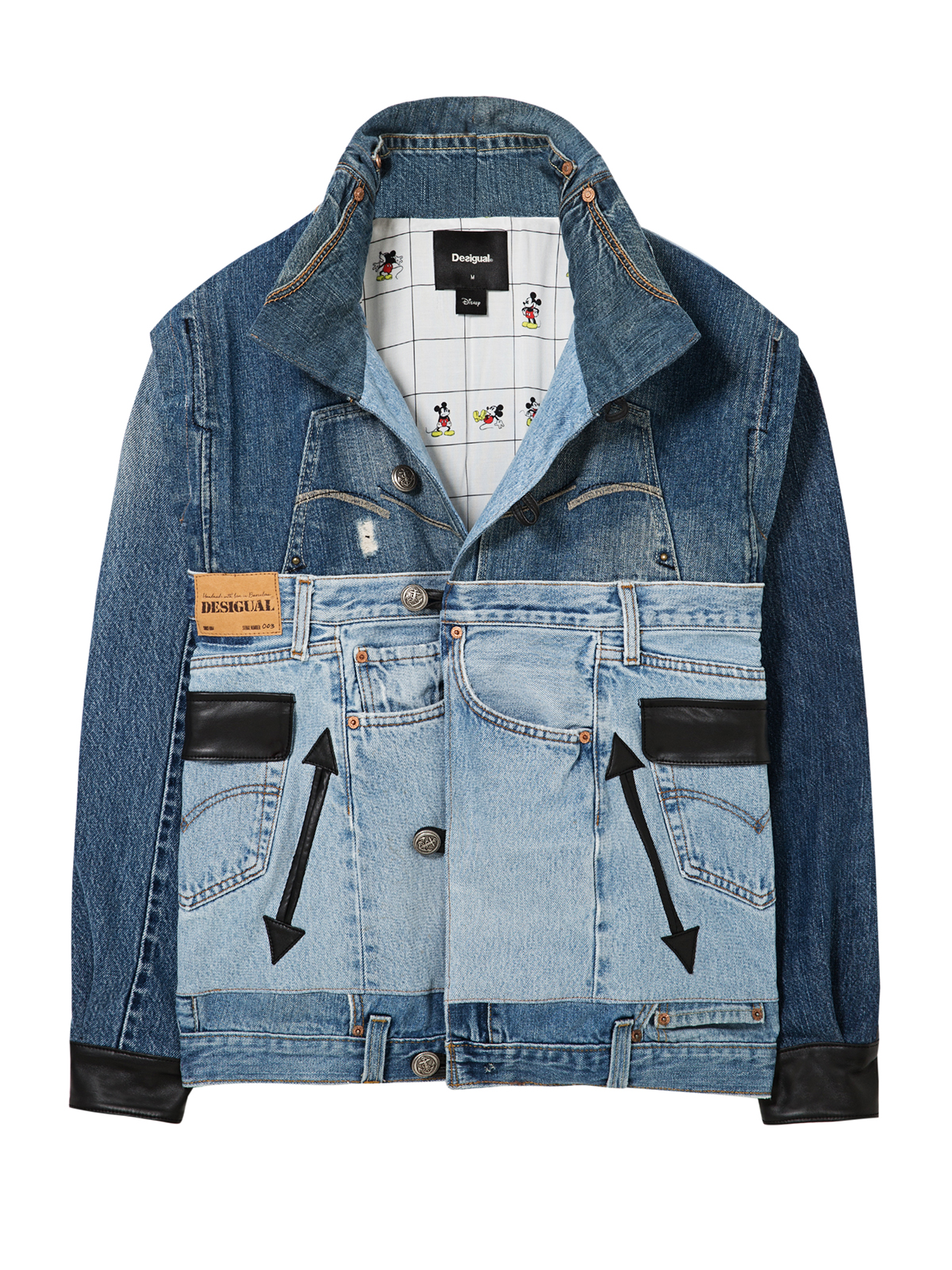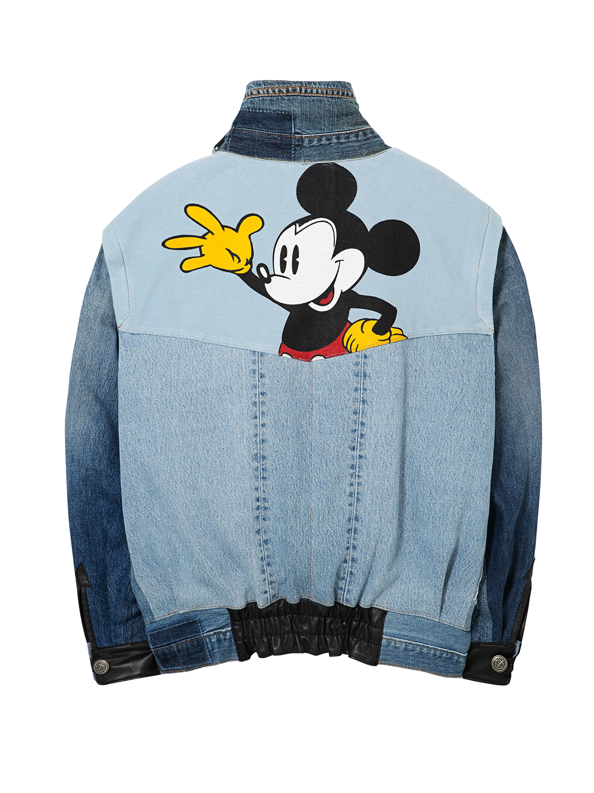 Una chaqueta única: De elaboración totalmente artesanal, a partir de retales de jeans, cada chaqueta es diferente y lleva impreso en su etiqueta un número de serie único. Incorpora un patch con Mickey Mouse en la espalda, igual que el original y el forro con un pattern con Mickey. Los puños son de cuero en color rojo, azul, negro o plateado.