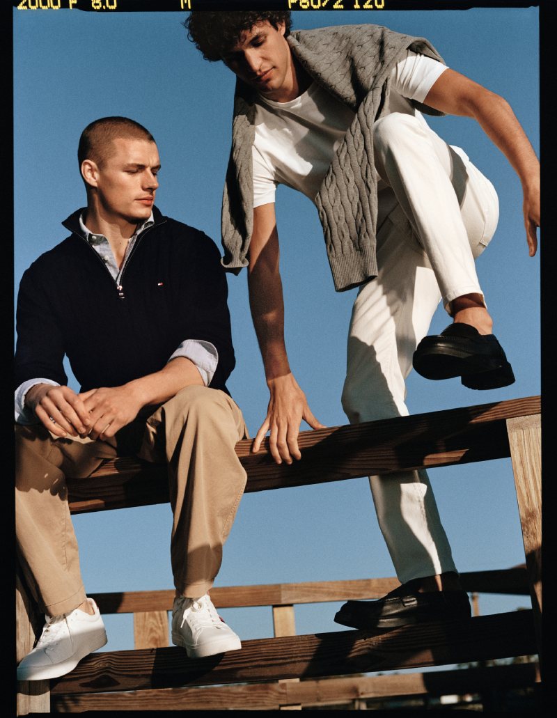 En el terreno de las partes de abajo, ¿qué mejor que un vaquero de lavado medio? La mayoría de estos nuevos looks de estilo preppy para otoño se hacen con jeans… y es por una muy buena razón. Los vaqueros rectos o slim pegan con todo, y los podemos llevar con una camiseta o con una americana y nos vamos a ver igual de bien. Pero si queréis algo más smart, la colección de Tommy Hilfiger para esta temporada también apuesta por los chinos en color khaki como esencial secundario… aunque también un pantalón blanco no puede fallar.
