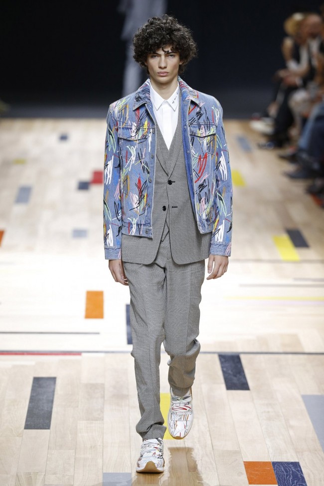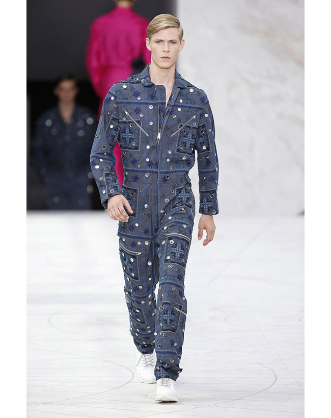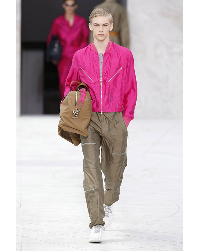 ¡Vuela! ¡Navega! ¡Viaja! (Volez! Voguez! Voyagez!) es el lema de la nueva propuesta que Kim Jones nos presenta para el aventurero hombre Vuitton. La escenografía está inspirada por su viaje a Jaipur, la ciudad rosa de la India, donde se encuentra el observatorio astronómico Jantar Mantar, construido por el Rey Sawai Jai Singh a principios del S. XVIII. Hounds Of Love de Kate Bush es la banda sonora perfecta para transmitirnos ese espíritu libre, tan propio de los años 70. Con una paleta cromática que va desde cálidos tonos tierra, pasando por los más calmados azules , hasta llegar a los más vívidos fucsias. Las cazadoras bomber se presentan como una de las piezas clave de esta colección en los colores clásicamente asociados a esta prenda: verde militar, naranja y negro. Los pantalones largos y rectos, con una cintura ligeramente elevada. Pequeños espejos bordados con la técnica del Shisha en monos de piloto. Todos los looks se finalizan con deportivas, no se presentó ni un zapato en toda la colección.