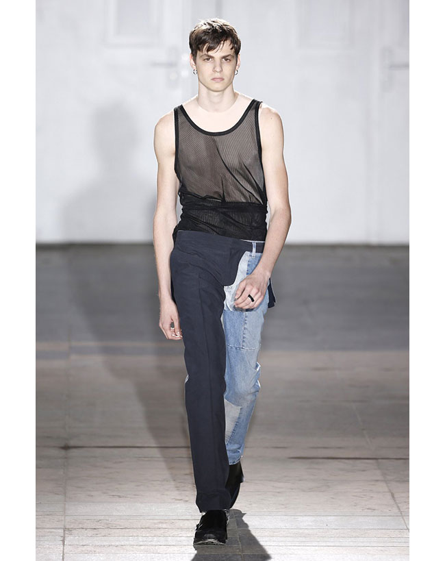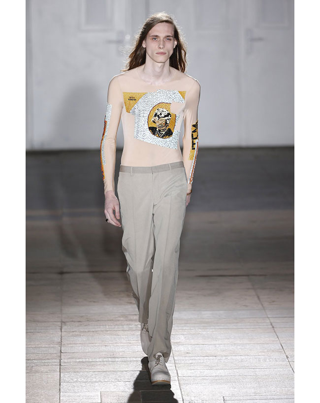 La marca conceptual por excelencia, cuyo fundador la abandonara hace años, primer graduado relevante de la Royal Academy Of Fine Arts Antwerp Fashion Department en los 70, quien todavía a día de hoy sigue manteniéndose como un misterio para todos, sumido en el más profundo anonimato. Para seguir los principios de Margiela, el equipo creativo también es anónimo, manteniendo las bases de la deconstrucción como pilar fundamental de la Maison. En esta ocasión la asimetría juega un papel muy importante, presente en pantalones híbrido: mitad denim, mitad lana. La invitación para asistir a la presentación era un retal de tejido blanco transparente, convencionalmente utilizado para la confección de paracaídas, material traducido en gabardinas y pantalones de grandes proporciones para la primavera del próximo año. Bodies en color nude, tan finos que resultan prácticamente imperceptibles, trabajados con bordados en tonos ocres, verdes, platas y negros, haciéndonos percibir que han sido cosido directamente en la piel de los modelos.
