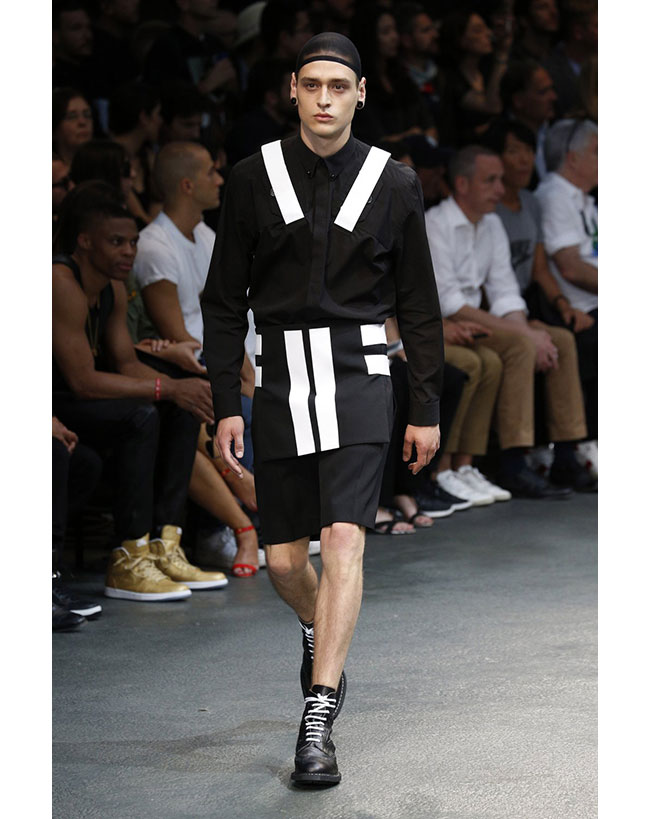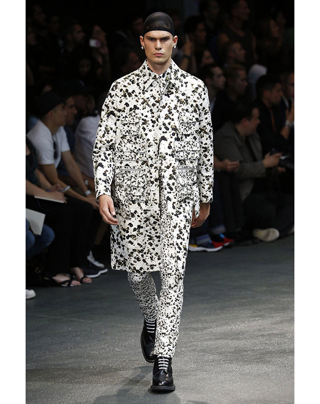 El avión que colgaba de los techos del Halle Freyssinet, lugar de convocatoria habitual para los shows de Riccardo Tisci en las últimas temporadas, es creación del artista Paul Veroude. Los fragmentos de aeroplano se encontraban suspendidos en el espacio, como si éste hubiera explotado y las piezas se mantuvieran en un estado de ingravidez. El director creativo de Givenchy cumple su quinto aniversario con la marca y para celebrarlo nos propone una colección que vuelve a sus propios básicos: blanco, negro y gris son los tres únicos colores presentes en la propuesta, tomando formas de estampados geométricos en unas ocasiones, evolucionando hacia la simplicidad de formas. También apuesta por estampados florales caleidoscópicos. Como viene siendo sello de la casa, todos los looks se finalizan con una media en la cabeza para alcanzar una estética de barrio.