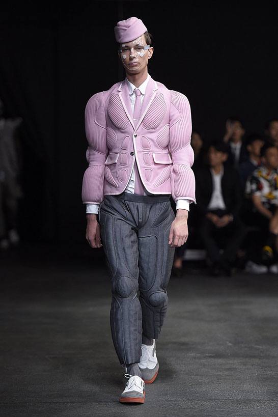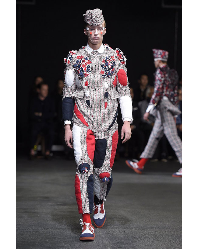 Al llegar al recinto donde nos citaron para presenciar el show que Thom Browne nos tenía preparado, descubrimos un tablero de ajedrez cuadrado que hacía la función de pasarela. Los modelos esperaban a que se congregara el público sentados en cubos negros. El desfile comienza, las luces se apagan y se encienden otras de neon, que provocan que las fibras de las prendas comiencen a brillar en la oscuridad al son de la banda sonora de la película Tron. Un desbordamiento de fantasía, inspirado en la estética futurista de películas como Liquid Sky, (en la cual se inspira para la creación de las máscaras transparentes, que también brillan en la oscuridad) y de personajes clave de la New Wave como Klaus Nomi, en quien se basa para construir uno de los dos tipos de chaquetas que propuso, las que presentan formas tridimensionales; las otras toman la forma de la musculatura humana. El efecto final hace parecer a los modelos soldaditos de juguete, en los calcetines y los hombros de algunos de ellos se posan curiosas mariposas, como si acabaran de salir del país de las maravillas.