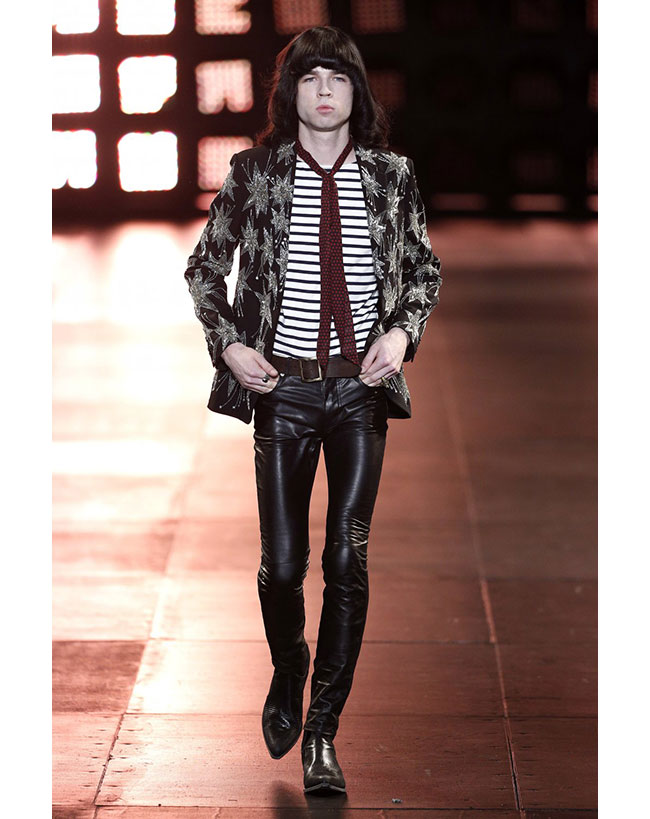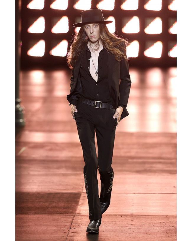 Aunque continúe siendo más de lo mismo, nunca nos cansaremos de entrar en el universo de Hedi, aunque solo sea durante la media hora que dura su show, el más vibrante de la temporada y que siempre cierra por todo lo alto la semana de la moda masculina de París, dejándonos con una sensación de ensoñación que únicamente él es capaz de producir. La clave para entender su visión es no fijarse simplemente en las prendas, sino ir más allá hasta alcanzar el Nirvana Slimane. En esta ocasión introdujo chicas en la pasarela, contando con un casting de bellezas extrañas como la de la modelo Natalie Westling, el DJ Josh Quinton de las fiestas Disco Smack, el actor Jack Kilmer y miembros de grupos como Skinnybones. La banda sonora corrió a cargo del grupo Mystic Braves.
