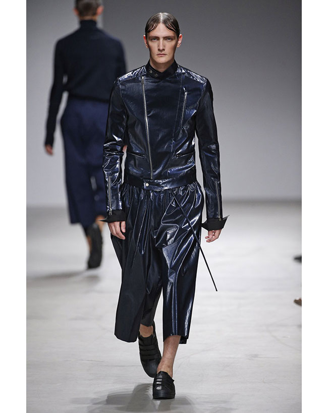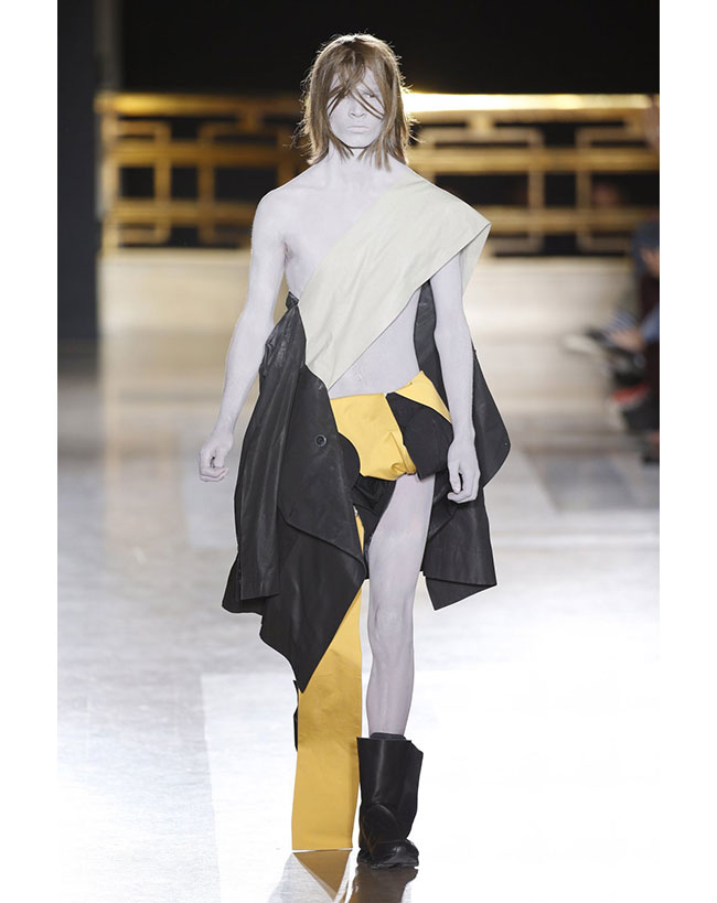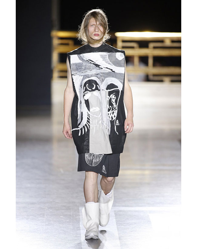 Las nuevas botas que Rick Owens nos presentó en colaboración con Adidas son un sueño hecho realidad, recién salidas de su mórbido imaginario, se combinan con interesantes vestidos-saco sin forma, experimentando con denim en diferentes variantes. La incursión de ilustraciones en algunas de las prendas se manifiestan como una rareza en el universo Owens. En esta ocasión la inspiración no es de origen extraterrestre, sino que estaba pensando en el ballet “La Siesta Del Fauno” de Vaslav Nijinsky, la cual culmina con el fauno masturbándose con el pañuelo de una ninfa, hecho escandaloso en la época de su estreno, la Belle Époque, que fascina a Rick. Los faunos lucieron una amplia gama de tonos pastel en su piel, que versó desde el verde hasta el morado. Todo ello conducido por la banda sonora de un remix techno de Nicki Minaj.
