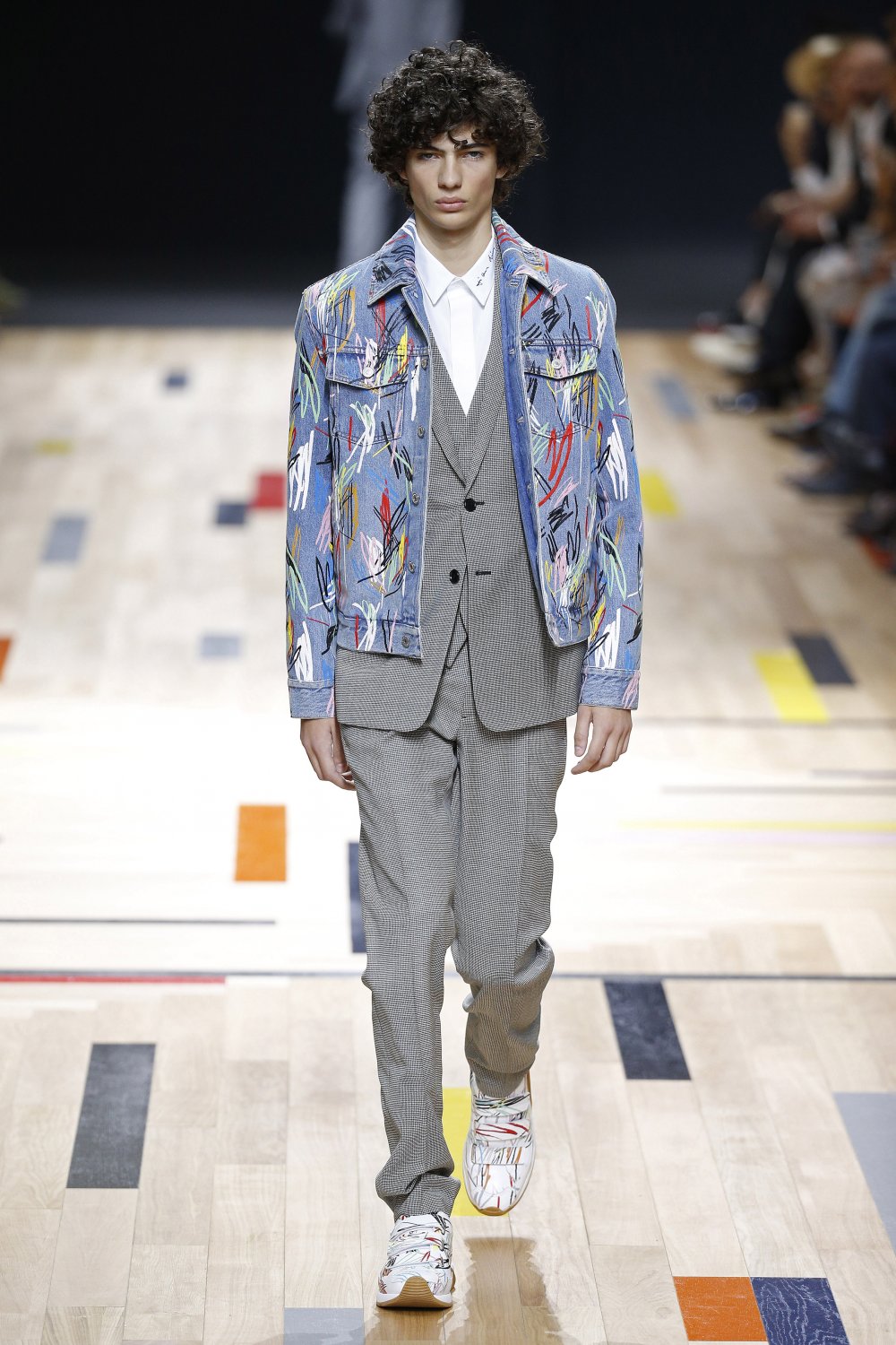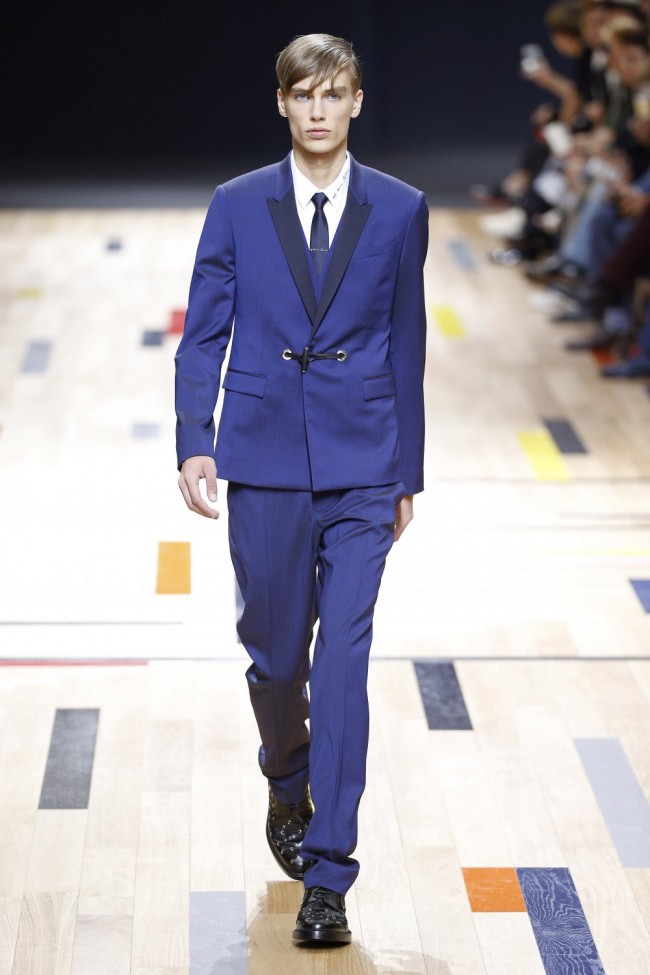 La temporada pasada ya comenzamos a percibir pinceladas de denim en algunos looks de la Maison francesa, combinados con zapatillas blancas de cordones, portadas por los dos últimos modelos que cerraron el desfile, hecho que nos hizo intuir que el normcore estaba a la vuelta de la esquina; pero definitivamente esta temporada ha llegado para quedarse, pantalones vaqueros anchos remangados combinados con zapatillas blancas deportivas (con tres velcros en esta ocasión, igual que las de Juun J para Adidas) son el leitmotif de Kris Van Assche para el próximo verano. La estética naútica se manifiesta en forma de camisetas de rayas horizontales y los trajes de chaqueta en profundos azules marino también nos evocan el mar. El hombre Dior SS15 no tiene ningún problema en combinar lo más arreglado de su armario con lo más deportivo, y funciona a la perfección.