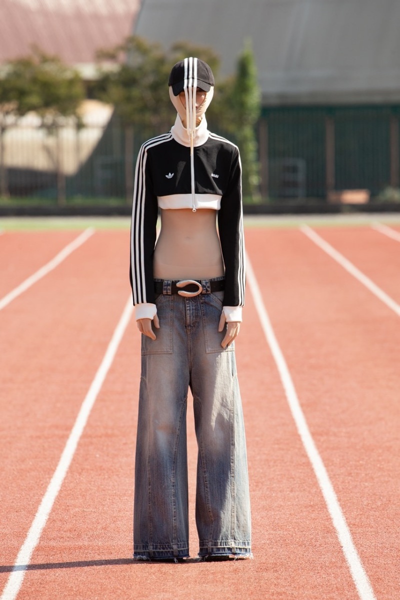La colaboración de adidas Originals X AVAVAV no fue lo único que vimos en pasarela; pero pensamos que esta junta merecía su propio spotlight. La cápsula abre con un top extremadamente ceñido de manga larga, que se complementa con una capucha y agujeros para los pulgares en las mangas. Y sí, con buena dosis de tres bandas a contraste. Seguidamente, tenemos reinterpretaciones cortas de la clásica chaqueta track; ¿qué tan cortas? Justo por debajo del pecho… arriesgando exposición.