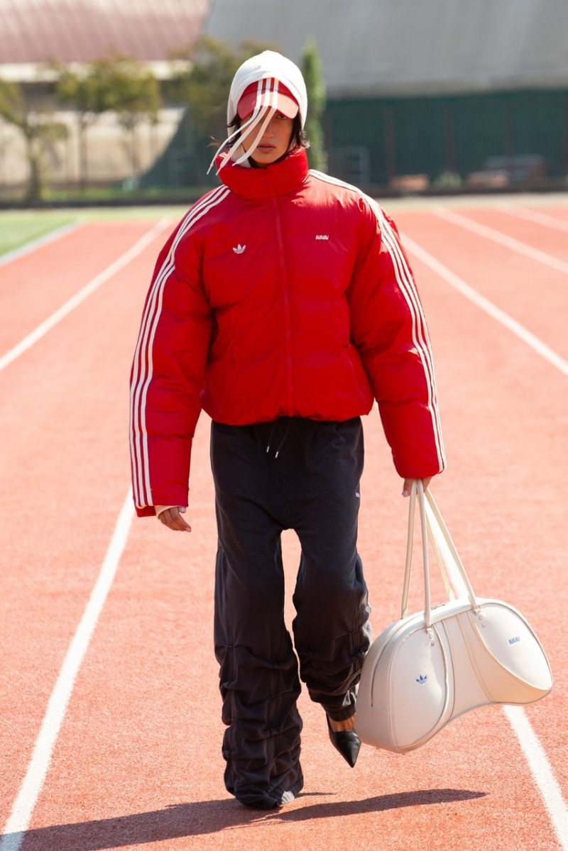 Pasando a los conjuntos en rojo, que los anteriores eran negros, adidas Originals X AVAVAV presenta un abrigo puffer de corte oversize con sus típicas bandas en mangas y branding en el pecho (como todas las demás prendas de la colección). Luego, vemos sets en rojo, una chaqueta-vestido con bajos slashed y uno que otro guiño de body paint emulando al clásico conjunto.