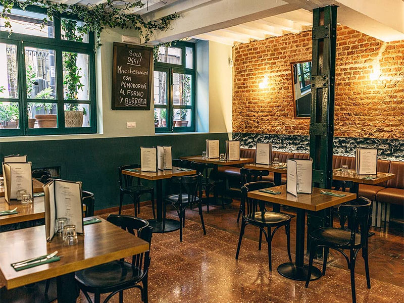 Menú mediodía: 12 €. Incluye pasta o pizza, bebida y postre o café.