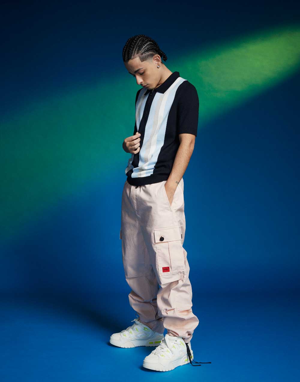 Total look de HUGO: Polo de manga corta de punto con cierre de cremallera con franjas de colores en el parte posterior + Pantalón estilo cargo en color rosa + Deportivas de perfil grueso, elaboradas en una mezcla de tejido revestido sintético