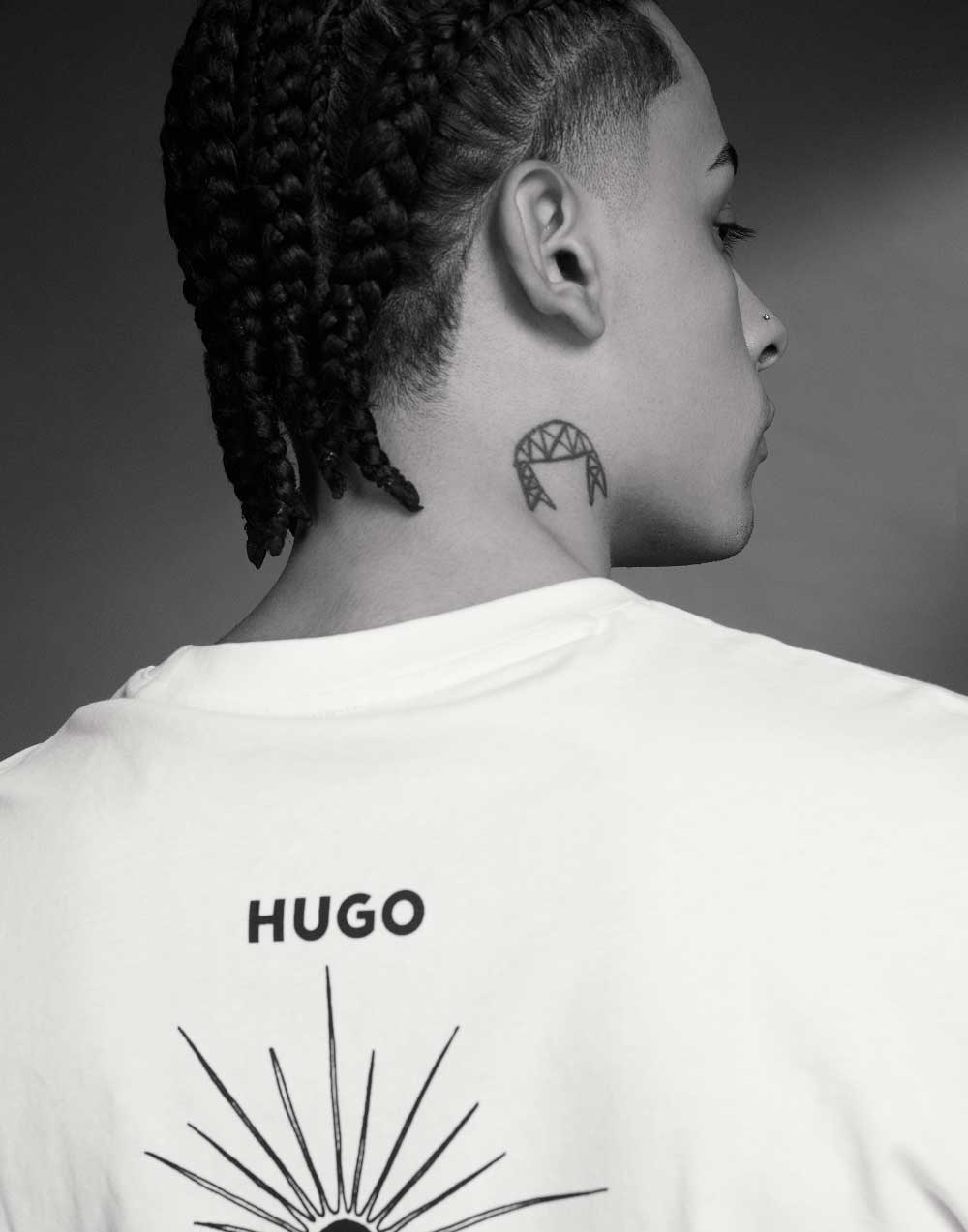 Total look de HUGO: Camiseta blanca de manga corta con ilustración estampada + Pantalón negro con un corte regular en tela elástica + Deportivas de perfil grueso, elaboradas en una mezcla de tejido revestido sintético