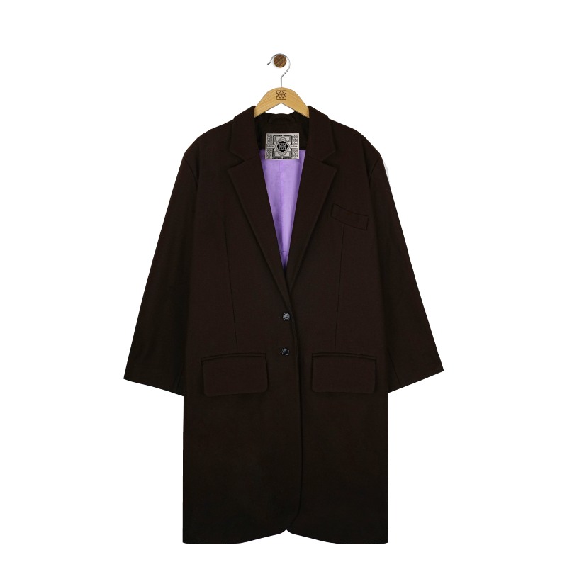 Tal y como el propio nombre entrecomillado indica, este abrigo parte de una americana redimensionada en la que observamos un aumento del tamaño del escote, solapas y mangas. Las cuales se presentan sobre unas mangas sentadas con hombreras anchas en color chocolate, el cual está construido en lana y cashmere. Esta pieza está inspirada en los anchos abrigos utilizados por los jóvenes Yuppies.