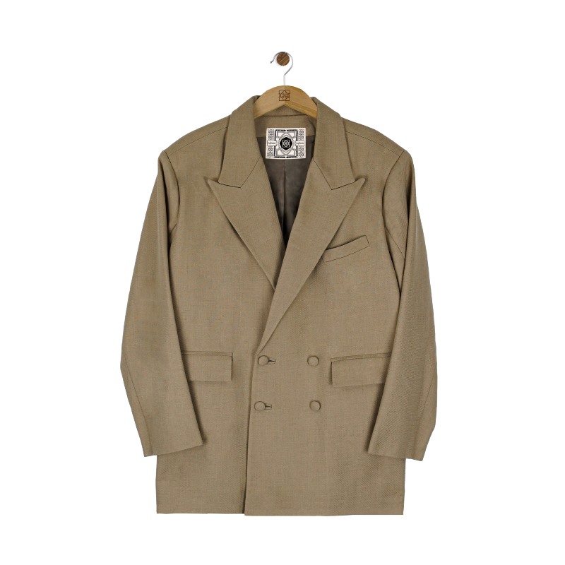 Como “básico” dentro del hilo conductor de esta colección, encontramos la americana cruzada. Cuenta con un patrón oversize de hombreras marcadas con solapas de punta de lanza, ojales de tela y 5 botones forrados con el fin de mimar al detalle la construcción de esta americana confeccionada en sarga de lana italiana de manera artesanal en Aragón.
