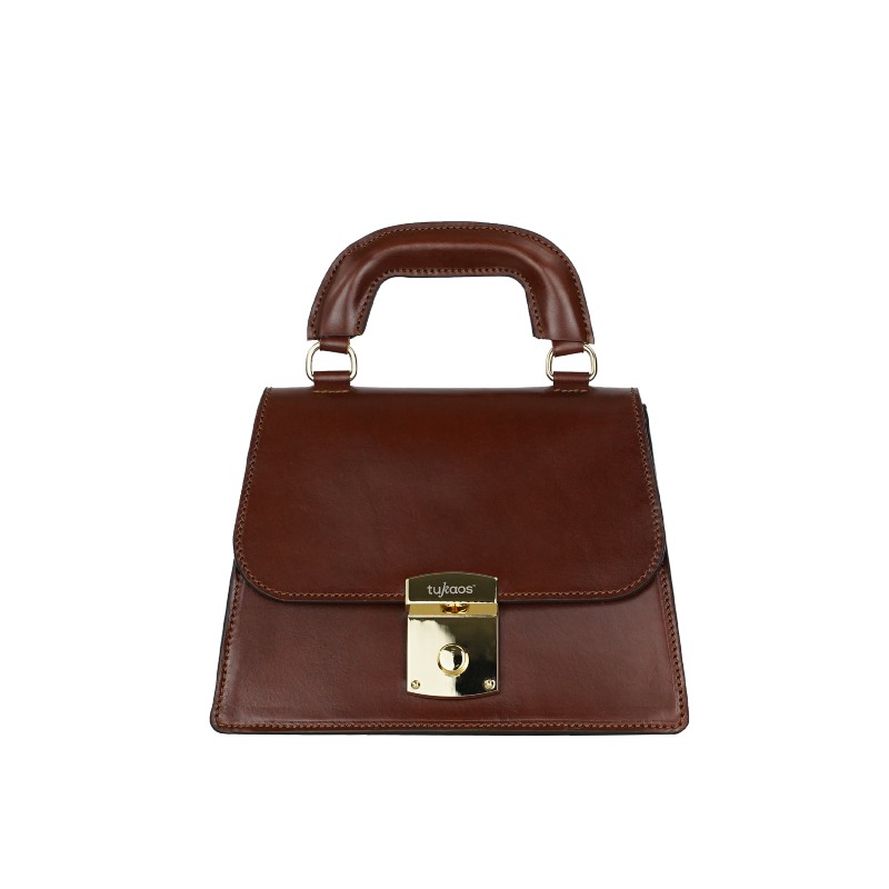 Este elegante bolso de piel de vacuno natural color coñac es una de las piezas joya de la colección. Está confeccionada de manera artesanal, una pieza que está inspirada en los maletines ejecutivos de los 80 llevados por la élite de la época. Su silueta trapezoidal junto con su dura asa conforman una silueta dominante. El logotipo de la Maison Tukaos preside el broche bañado en oro posicionado en el frontal del bolso. Esta pieza de alta marroquinería se ha elaborado a mano en el prestigioso estudio Febó de Momplet en Valencia.