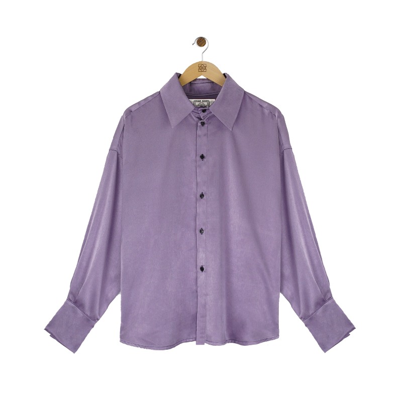 Otra de las piezas que no pueden faltar en la colección es esta camisa con corte oversize. Está confeccionada en seda 100% natural color lavanda con cuello en pico, hombro semi caído y vuelo. Es una reversión de la camisa mítica de los ochenta, pero con un detalle diferente: se elimina la masculinidad tóxica con el color.