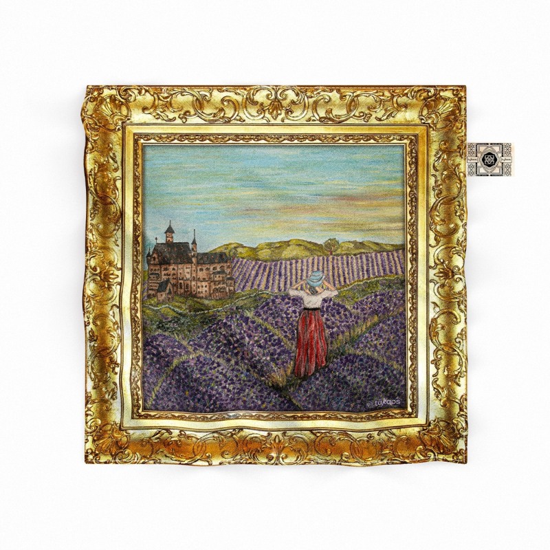 Teniendo en cuenta el gran gusto y elegancia de los jóvenes Yuppies, creamos una línea de pañuelos. Todos ellos simulan ser cuadros enmarcados sobre la provenza española. Esta pieza de seda es twill 100% natural. Todas están creadas originalmente en óleo sobre un lienzo por la artista plástica: Patricia R.A. En todos los pañuelos se realizó un escaneado y montado sobre un marco de madera con pan de oro de manera digital e impreso sobre la seda a través de la técnica DTG.