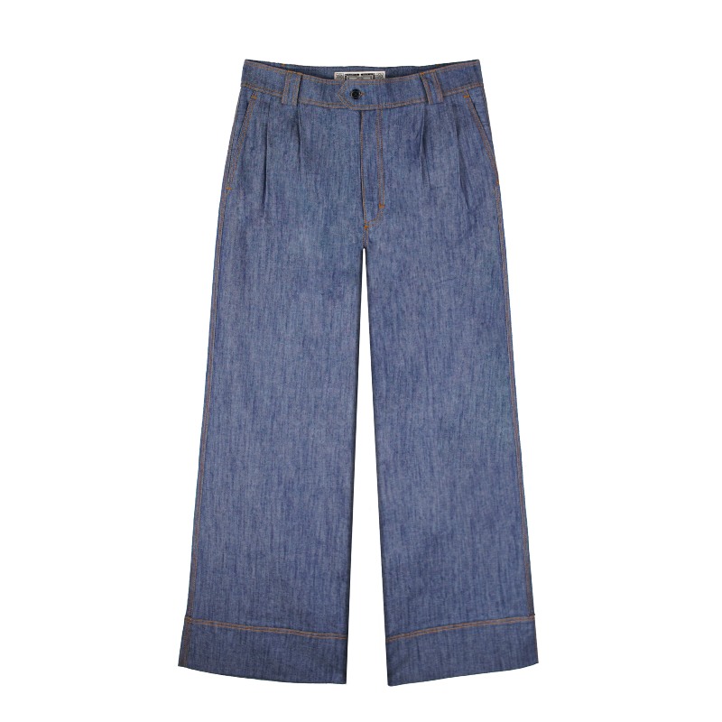 A través de la reinterpretación clásica de un pantalón palazzo, creamos esta pieza en formato de vaquero color azul con corte oversize. Tiene cuatro pinzas y bolsillos franceses en el delantero con bolsillos de ojal en el trasero. Las costuras exteriores están acabadas con la característica doble puntada de torzal naranja. Los interiores están acabados con la técnica “overlock”. Tiene un fin que es favorecer la durabilidad de la prenda.