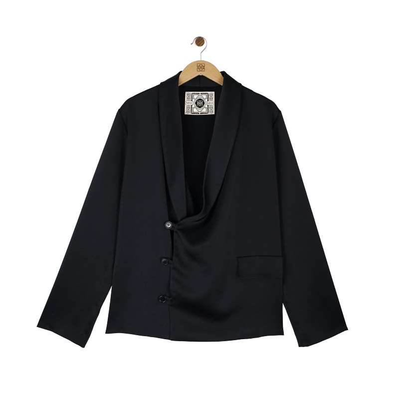 Inspirada en la silueta de la clásica chaqueta Smoking, la cual se situaba sobre el traje para evitar que el olor del tabaco se quedará impregnado en la ropa a la hora de fumar. Es una camisa cruzada de seda natural, que posee un escote de estilo drapeado en el cual se cierra en el lateral derecho de la prenda con tres botones de pasta de poliéster reciclado.