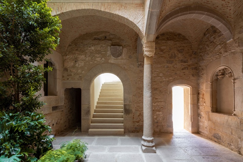 La Casa Palacio Paredes-Saavedra se encuentra a pocos metros de Atrio. Fue elegida para alojar las once habitaciones más que completan la oferta de este lujoso hotel de carácter familiar. Un ejemplo de arquitectura fortificada del siglo XV, con varias ampliaciones en los siglos posteriores. La reforma de Tuñón y Albornoz sigue la misma narrativa de diseño que Atrio, incorporando fachadas interiores de pilares de hormigón blanco. La distribución de los dormitorios ensalza la identidad de los espacios de épocas diferentes “en esta estructura tan económica de casa palacio (el claustro ni siquiera tiene cuatro columnas, solo dos), donde las ampliaciones de cada siglo tienen prácticamente el tamaño de una habitación”. Y enfatiza la singularidad de sus ventanas traídas de distintos lugares, que hacen “difícil descifrar este extraño montaje a lo largo de la historia. No solo por el crecimiento, sino por la superposición de estructuras”, relata Tuñón.