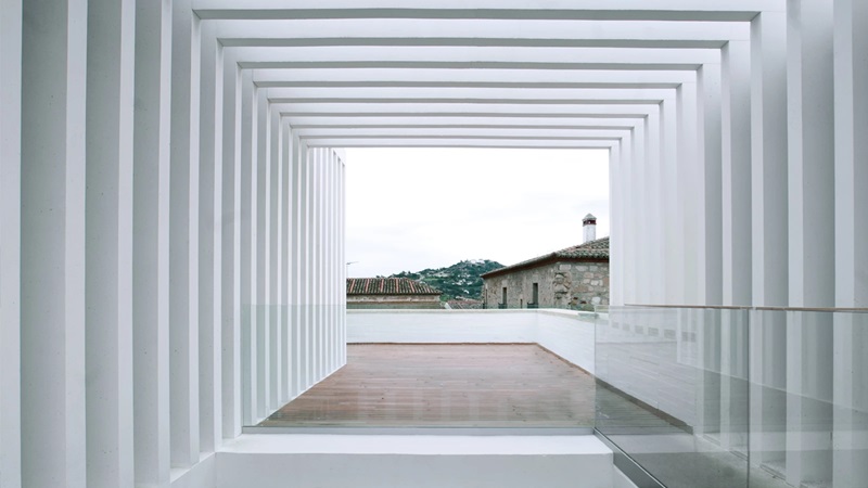 El primer proyecto de Emilio Tuñón en Cáceres fue El Hotel y restaurante Atrio, firmado por Mansilla + Tuñón en el corazón del casco antiguo. En la plaza de San Mateo, junto a la iglesia homónima y el convento de San Pablo (donde hay que ir a probar los exquisitos dulces artesanales). El estudio realizó la rehabilitación de dos antiguos edificios para crear un complejo boutique, integrado por un restaurante de tres estrellas Michelin y un hotel de catorce habitaciones con privilegiadas vistas a la Ciudad Monumental. “Atrio es una máquina de mirar, hacia los fragmentos del casco histórico enmarcados por esas ventanas. Un objeto que permite ver y entender la ciudad de otra manera”, dijo Tuñón en la conferencia inaugural de la exposición Tuñón Albornoz Estructuras en el Palacio de Camarena.