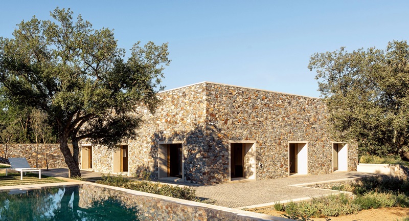 La Casa de Piedra es la única obra de Tuñón y Albornoz en Cáceres que no se encuentra en la parte antigua, pero dialoga con ella. Y es que esta vivienda con jardín, asentada sobre una colina a las afueras de la ciudad, presume de una envidiable panorámica al casco antiguo. Una conexión visual, que el estudio convirtió también en material usando cuarcita local: “Queríamos utilizar la piedra histórica de Cáceres mirando a la ciudad”, comenta Tuñón. Su diseño es una reinterpretación de los antiguos chozos de pastor de la región de Extremadura. El resultado es una casa formada por nueve células de la misma dimensión (de 4,20 m x 4,20 m), distribuidas en tres filas de tres. La pieza central funciona como patio interior y el resto como estancias pasantes, conectadas entre sí y abiertas al bello encinar del entorno.
