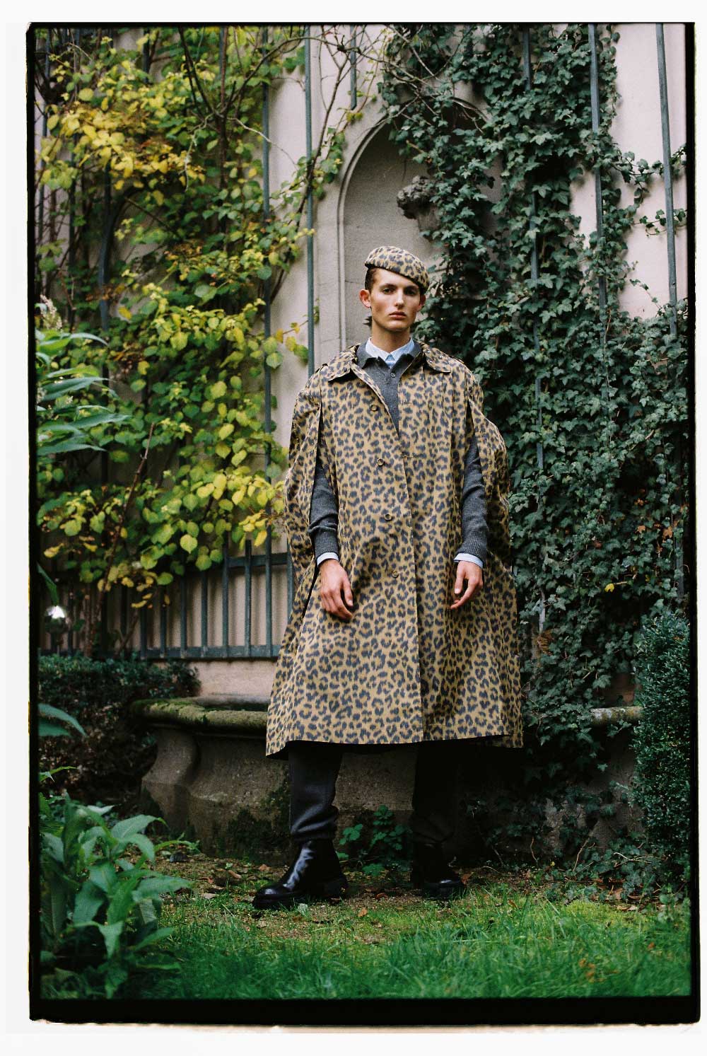 DIOR MEN: capa en tejido impermeable con aberturas laterales en estampado de leopardo, jersey de punto gris, camisa de rayas en popelín, pantalones de punto y boina