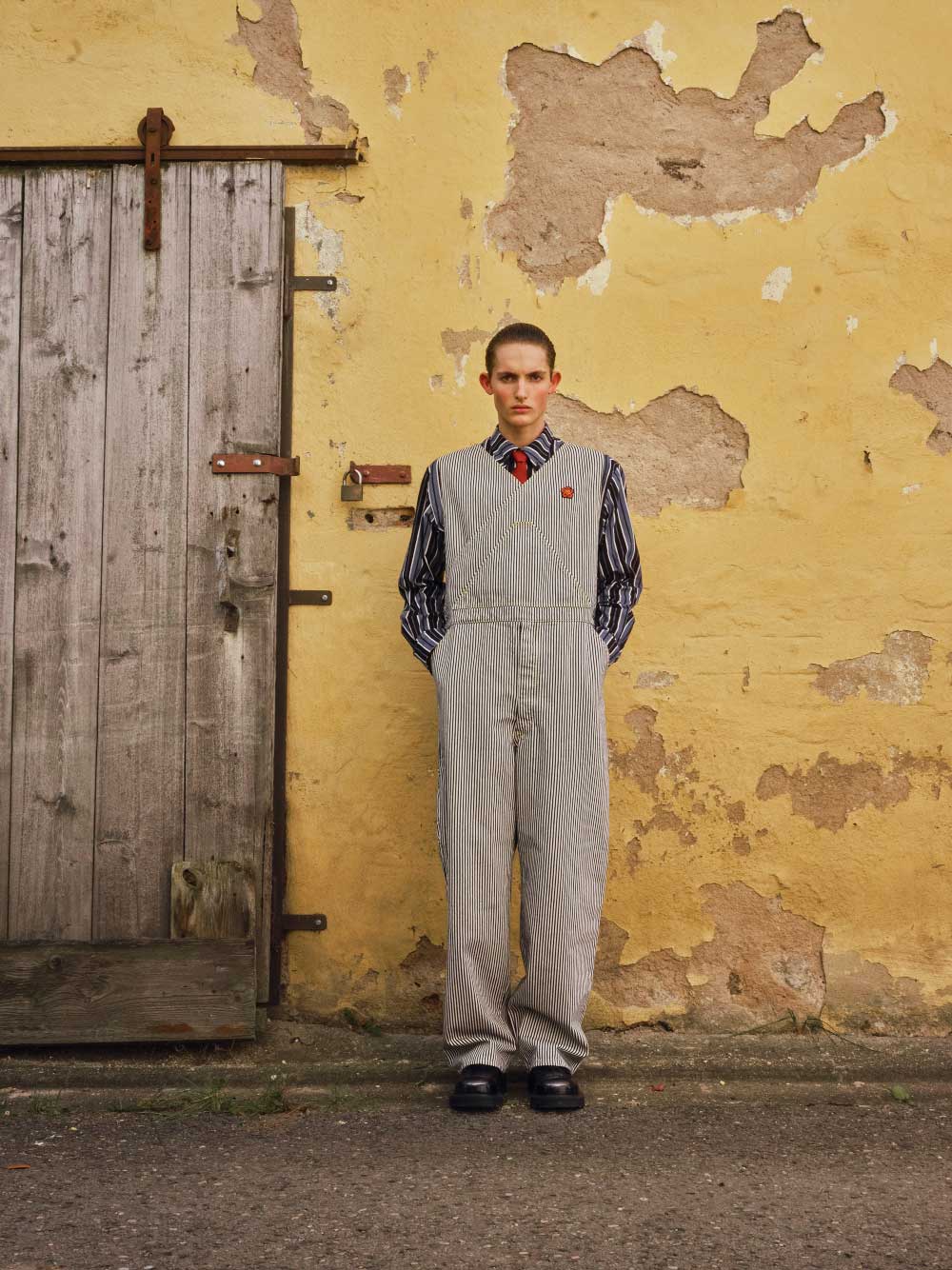 KENZO: jumpsuit oversize, camisa de pana con estampados de rayas, corbata en seda roja & botas de cuero