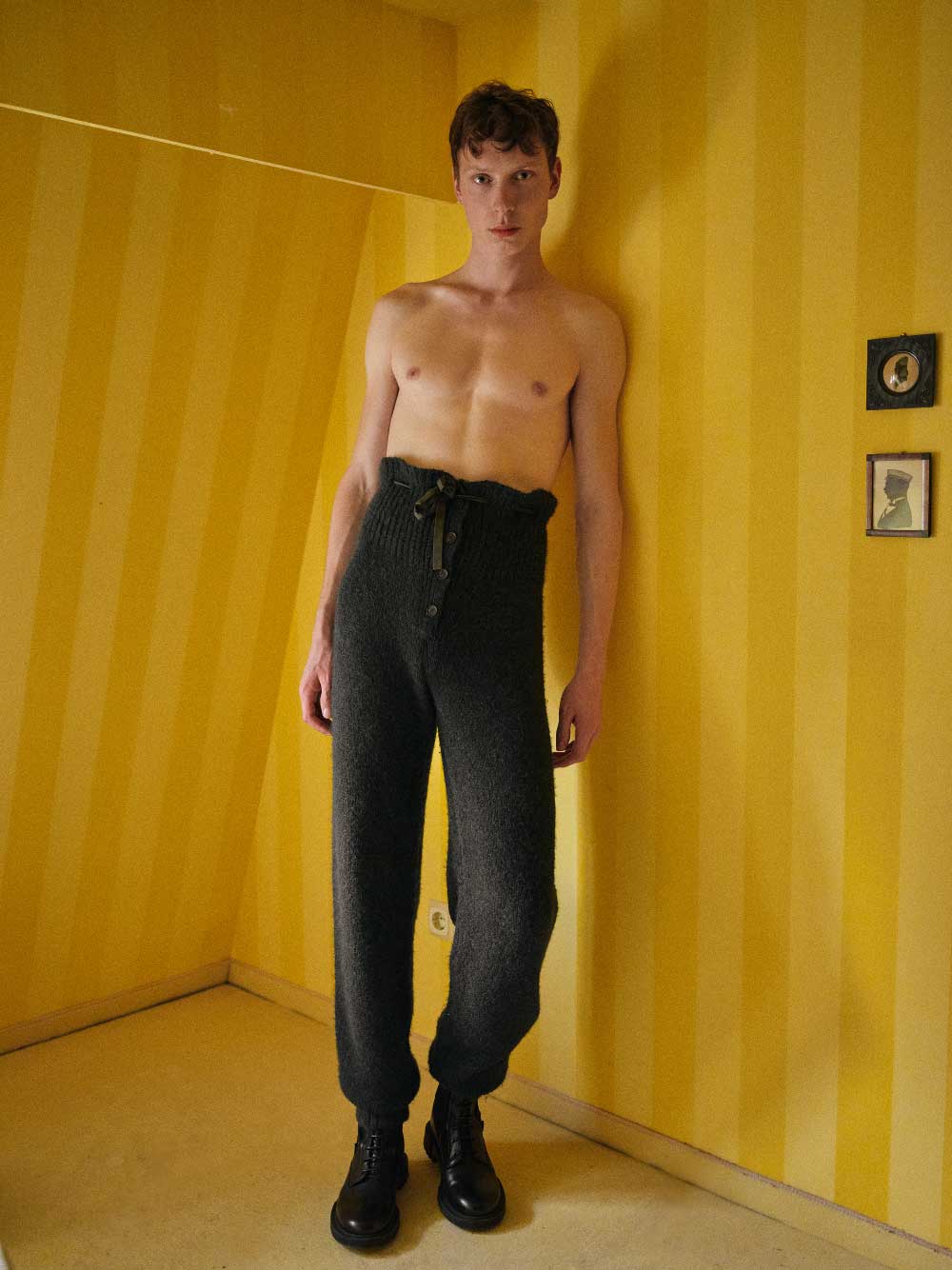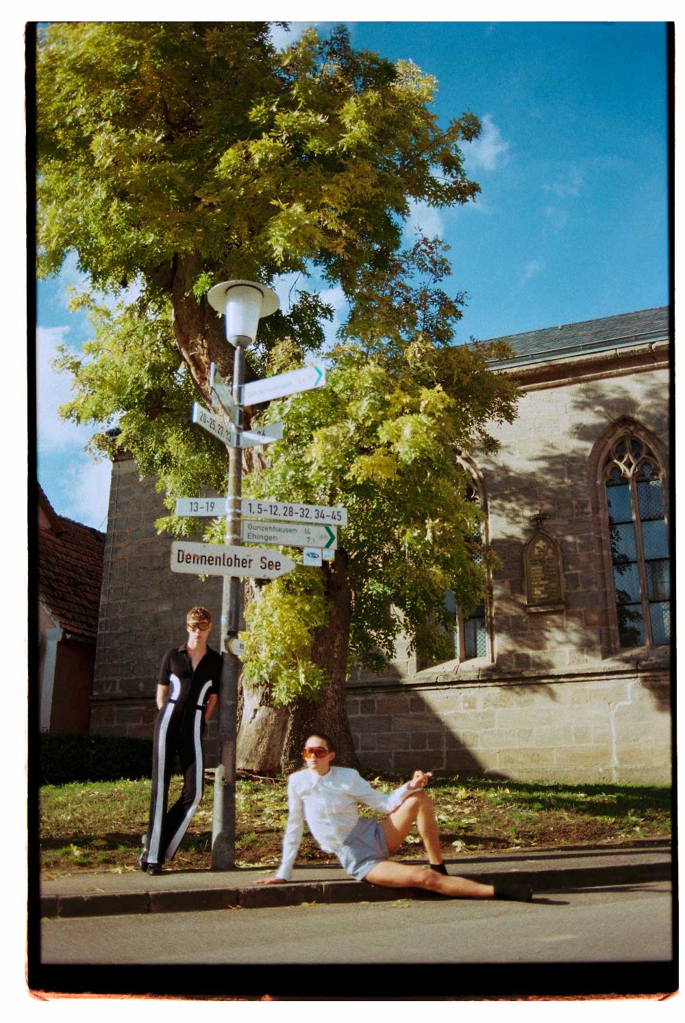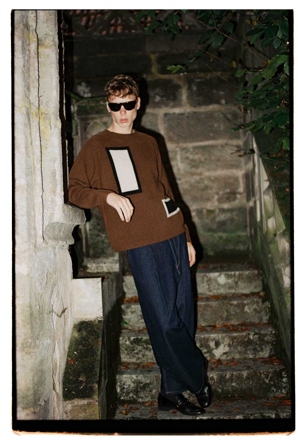 LEVI’S: jersey de punto con estampado geométrica y pantalones vaqueros oversize (exterior del Castillo Dennenlohe)