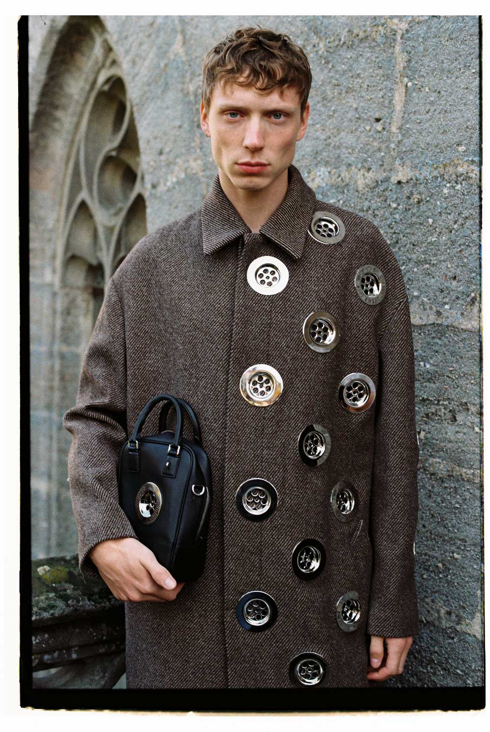 LOEWE: abrigo de lana con detalles metálicos, shorts en lana gris & bolso en piel con detalle metálico (exterior del Castillo Dennenlohe)