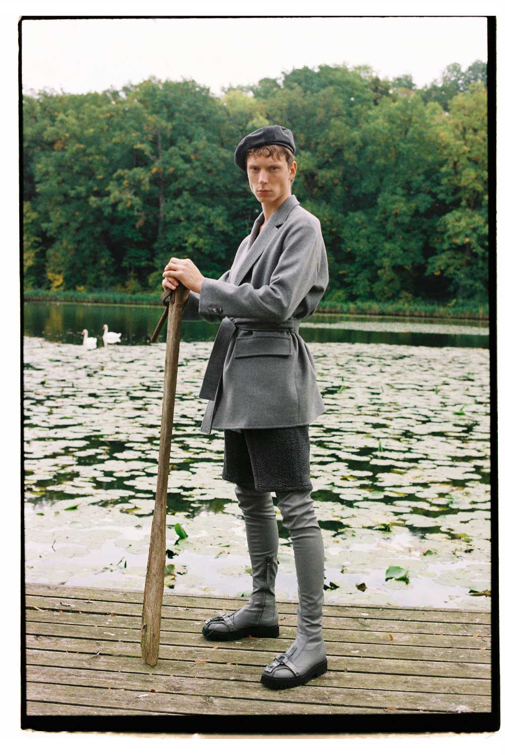 EMPORIO ARMANI: chaqueta cruzada con lazada en lana gris, shorts, boina y botas altas de cuero
