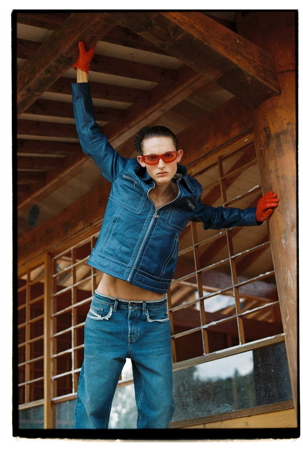 DIESEL: cazadora en piel ecológica azul, pantalones vaqueros deconstruidos, guantes rojos en piel con cremallera y gafas de sol