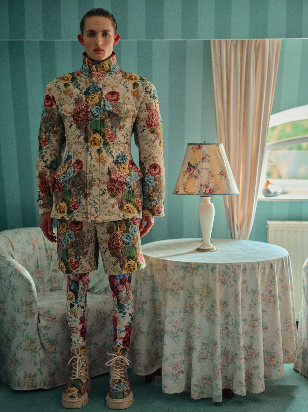 LOUIS VUITTON: chaqueta estructurada con estampado floral, bermudas, mallas y botas