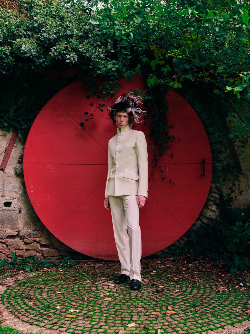 MANS CONCEPT: chaqueta con botones forrados y bolsillos delanteros, pantalón blanco de lana & tocado de piel ecológica y plumas (Jardines del Castillo Dennenlohe)