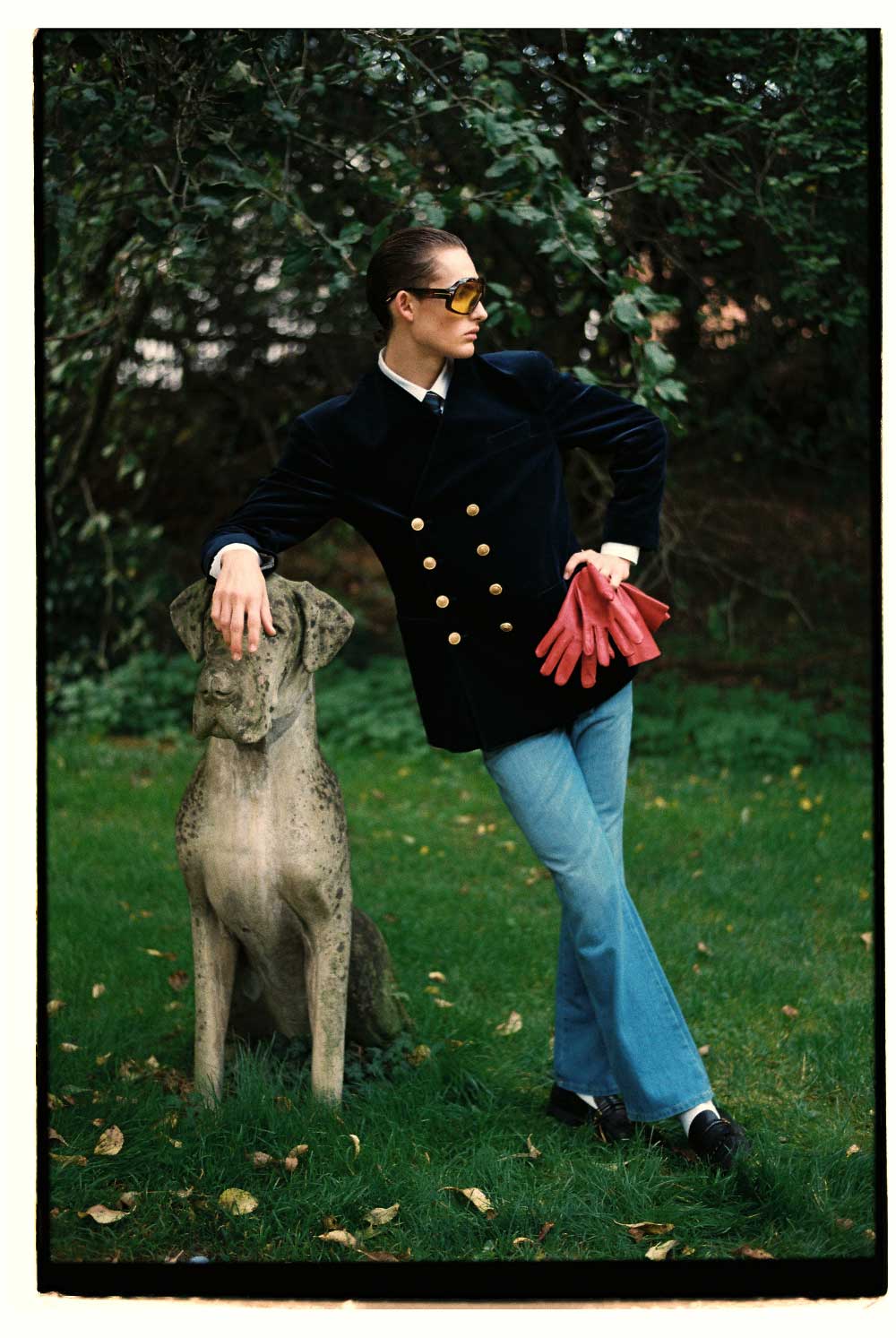 GUCCI: Blazer cruzada de terciopelo azul con botones militares dorados & corbata + UNIQLO: camisa en popelin + GANT x WRANGLER: pantalones vaqueros acampanados + TOM FORD: gafas de sol (Jardines del Castillo Dennenlohe)