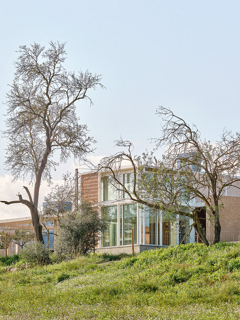 Materiales: Madera de iroko, celosía de terracota, vidrio, mortero de cal, baldosas vitrificadas, hormigón pulido, cerámica, paneles sándwich, acero