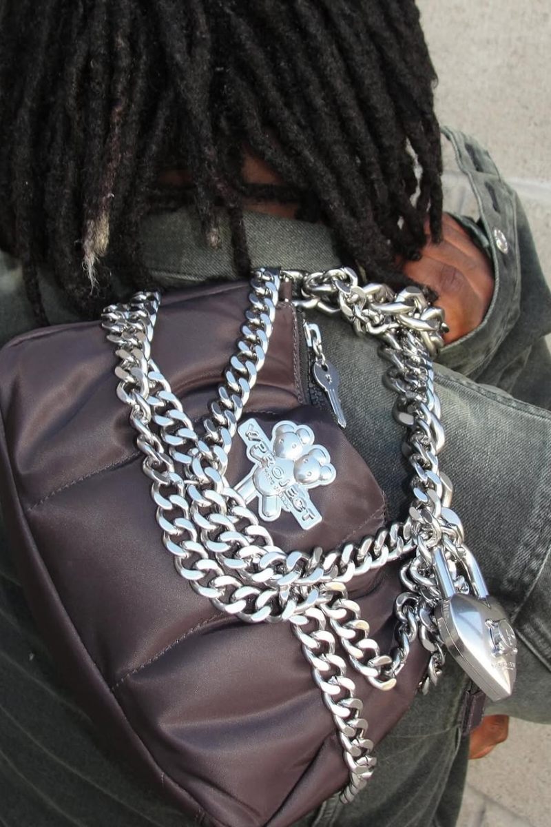 En cuanto a los accesorios de Y/Project X Heaven, hay joyitas (literalmente), Este repertorio abre con unos pendientes metálicos en forma de mariposa, que vemos también en un collar de cadenas finas. Como it-bag de nostalgia urbana, la silueta clásica de Heaven en nylon se acentúa con cadenas de eslabón cubano y charms de candados en forma de corazón (con sus respectivas llaves, claro). También tenemos unos pendientes en de fresa y un cinturón con el mismo hardware.