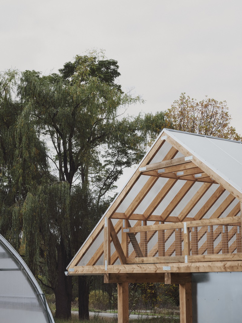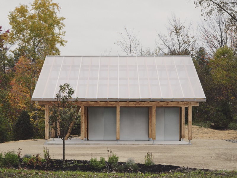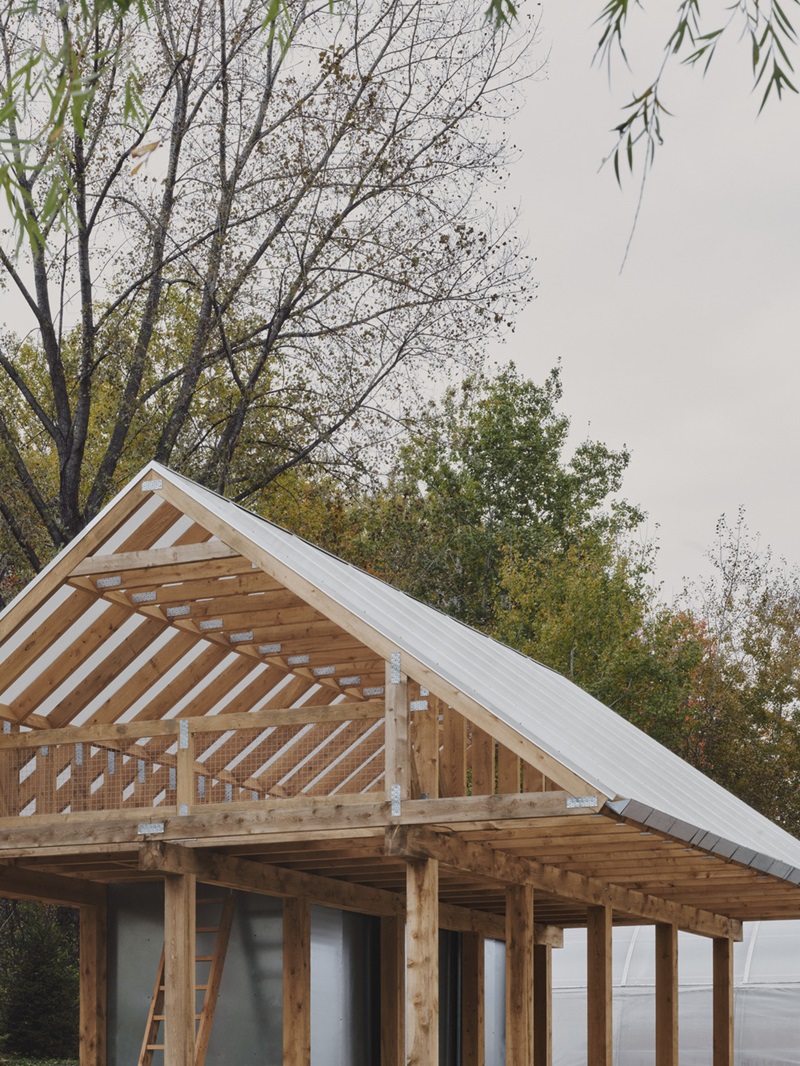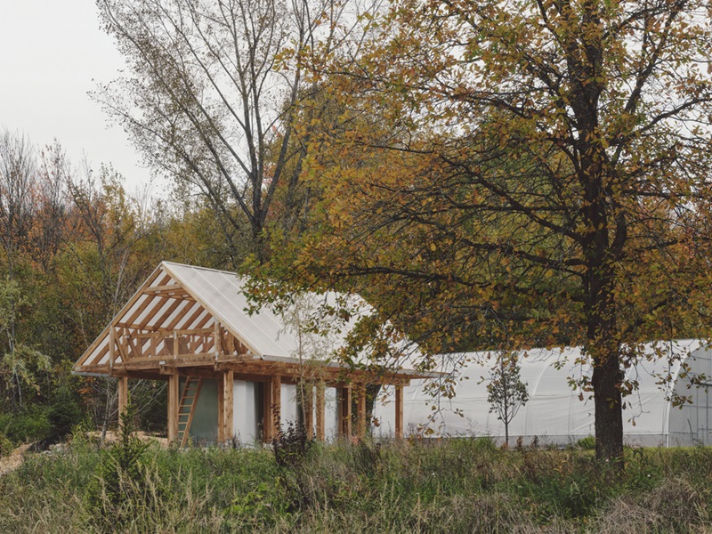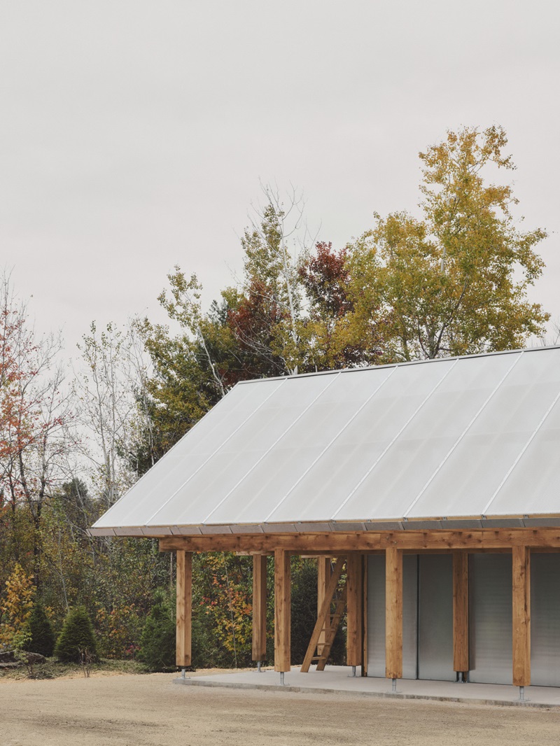 El estudio de arquitectura canadiense Atelier L’Abri diseña una construcción polivalente exterior para las iniciativas agroalimentarias promovidas por Maison Melba en los prados de la provincia de Quebec.