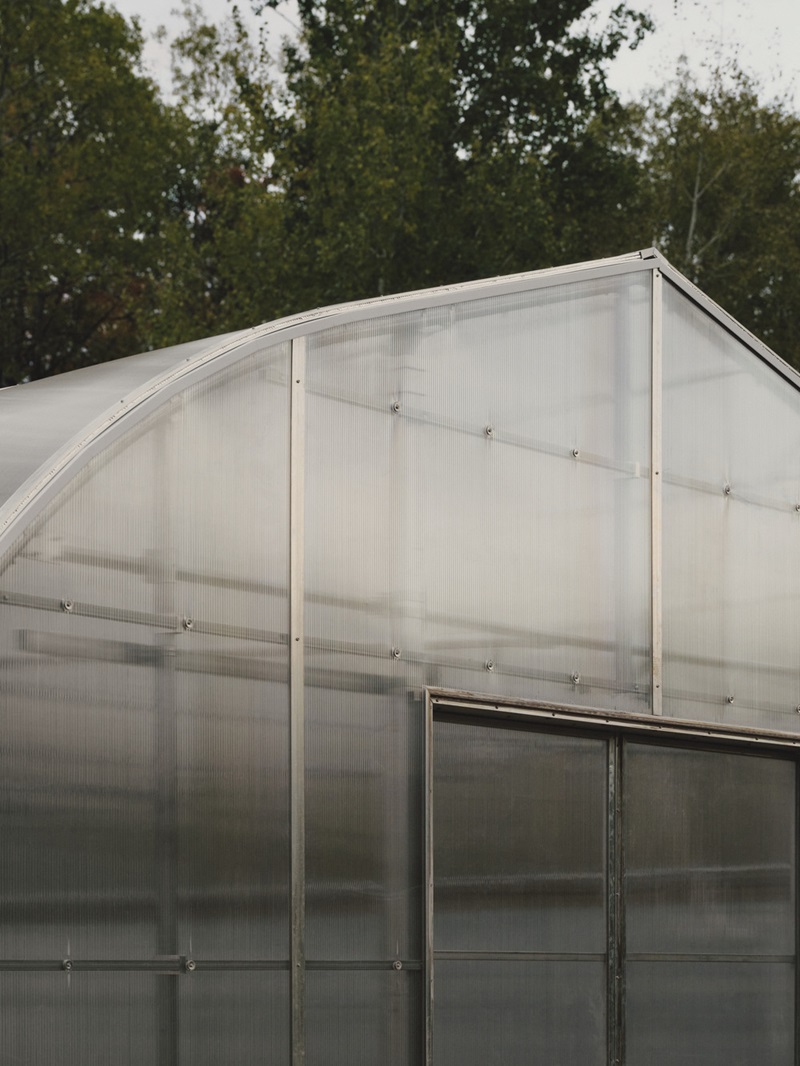 La distribución del espacio se organiza en una planta baja abierta al exterior con un núcleo de paneles de acero galvanizado y un nivel superior resguardado bajo una cubierta inclinada a dos aguas que sorprende por su elegante estructura de cerchas. Los paneles del techo están fabricados con policarbonato translúcido. Este material no solo posibilita la entrada de luz, sino que además establece un diálogo estético con el invernadero adyacente.
