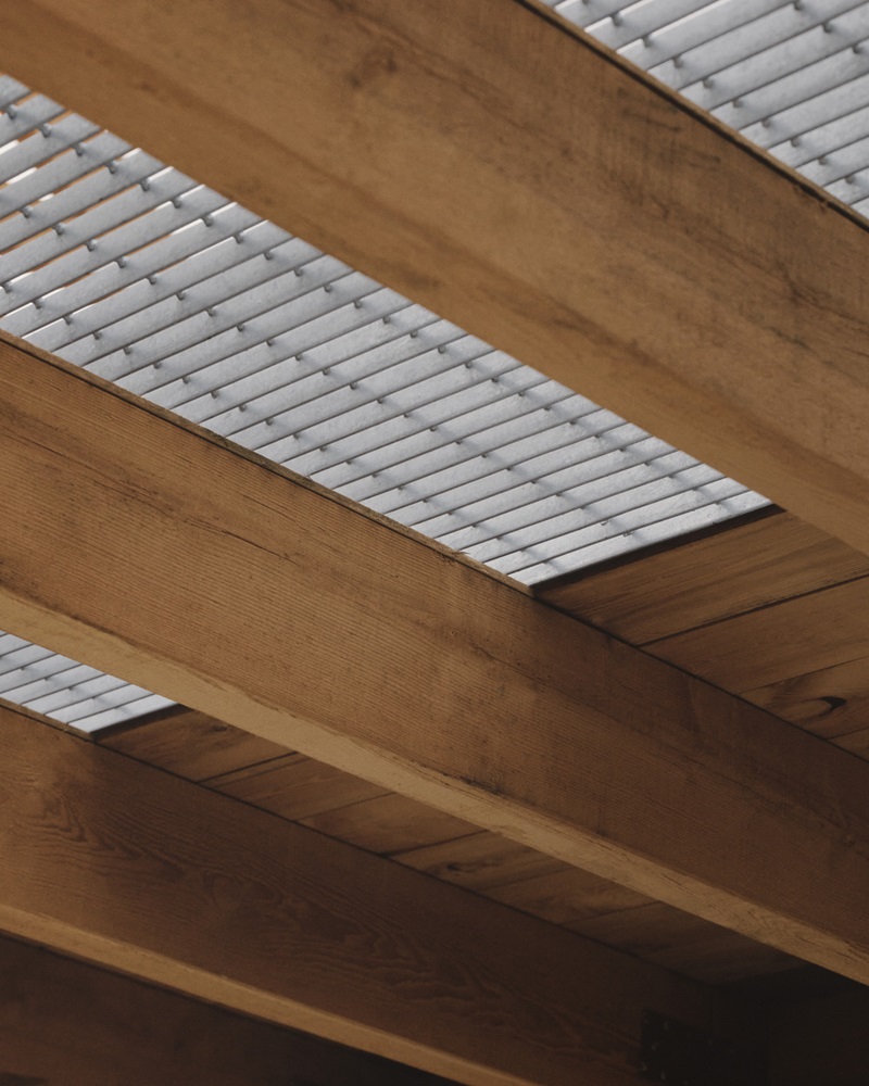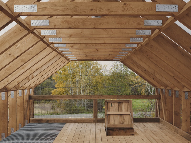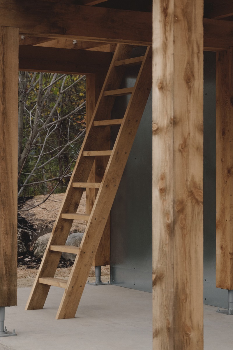 El diseño del pabellón rinde culto a la sencillez de las arquitecturas rurales, célebres por sus formas simples arraigadas a la tradición artesana. La estructura es de madera de árbol de cicuta local. Una elección con la que los arquitectos reivindican una construcción sostenible basada en el uso de materiales del lugar con bajas emisiones de carbono.