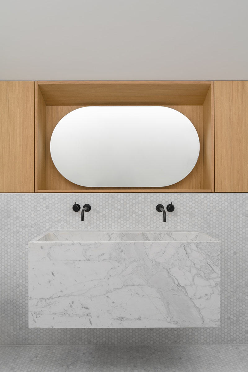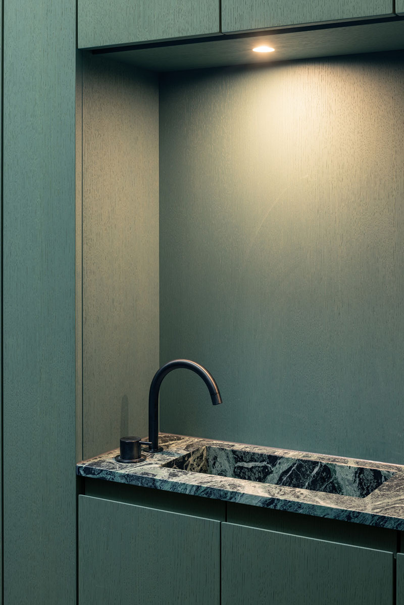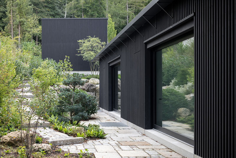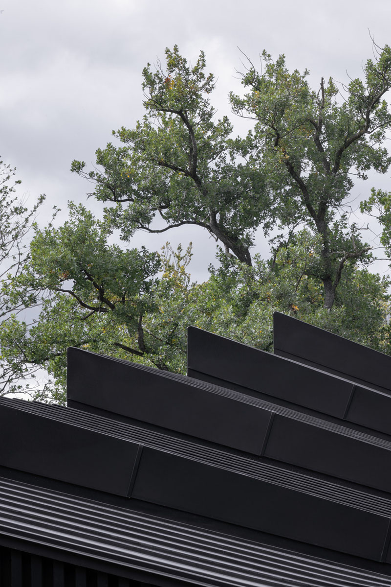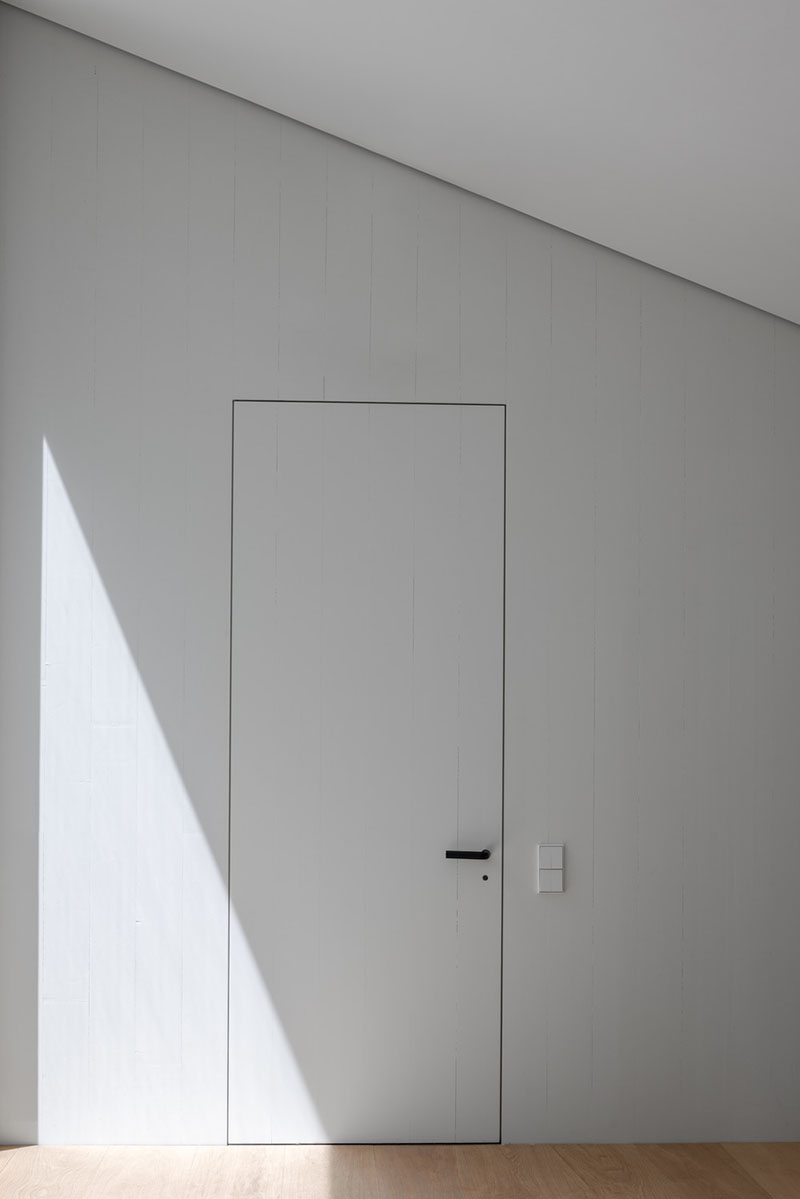 La forma del tejado en abanico contrarresta la inclinación del terreno, infundiendo variedad al interior. En la fachada, la escultura espacial aparece en rítmicas alternancias de abierto y cerrado. Aquí, listones de madera cubren los cubos, mientras que las ventanas desaparecen tras contraventanas plegables translúcidas que pueden abrirse para disfrutar de una vista sin obstáculos. En la planta baja, los enormes ventanales pueden ocultarse completamente en huecos en la pared. Del mismo modo, la cocina también puede abrirse totalmente al espacio exterior.