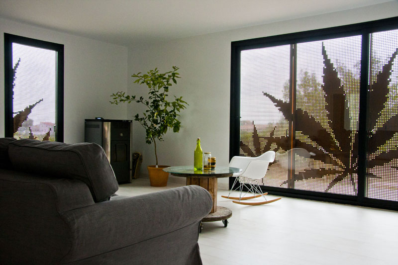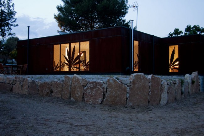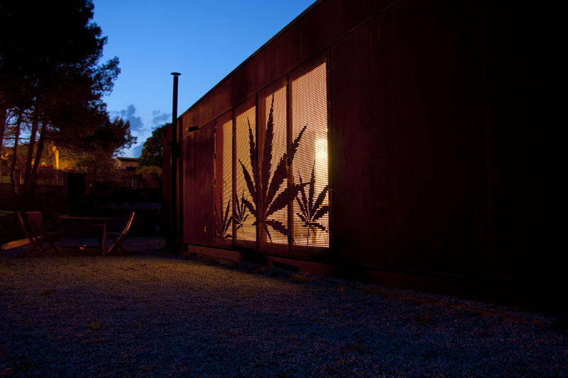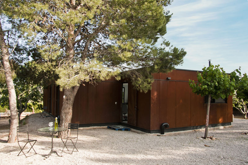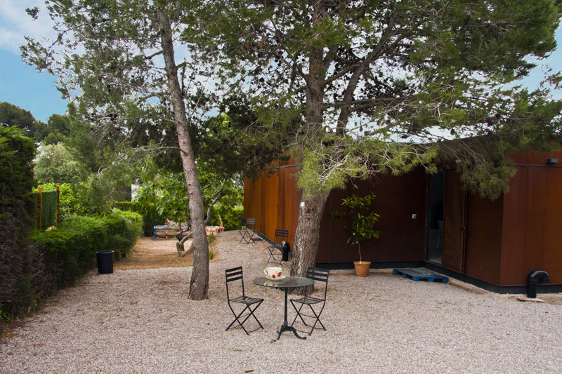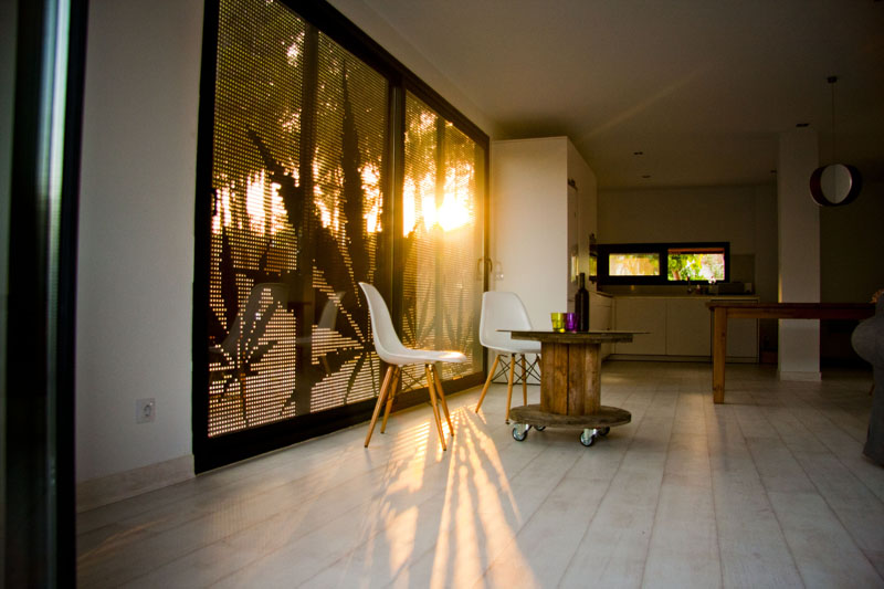 Casa Menta está desarrollada en una sola planta, con un espacio principal de Salón-Comedor-Cocina tipo open space, más dos habitaciones y un baño. Las contraventanas son de acero corten perforado, completamente integradas en la fachada y personalizadas con hojas.
